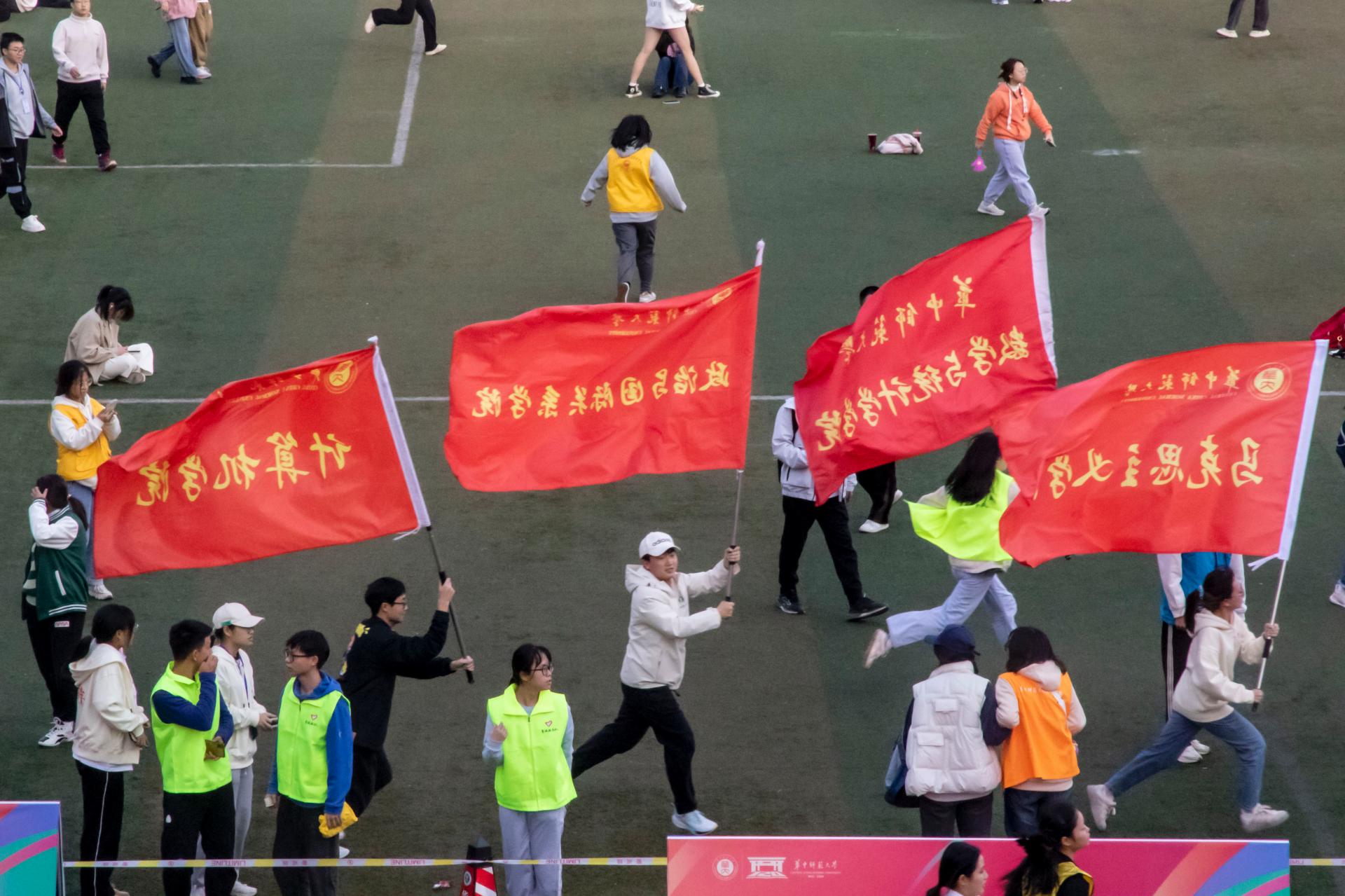 1500m赛跑期间,除了看台同学的呐喊鼓舞,数位志愿者在田径场内交替传递院旗,陪伴选手长跑。院旗飘扬,如同火光熠熠,为参赛选手注入强劲信心。