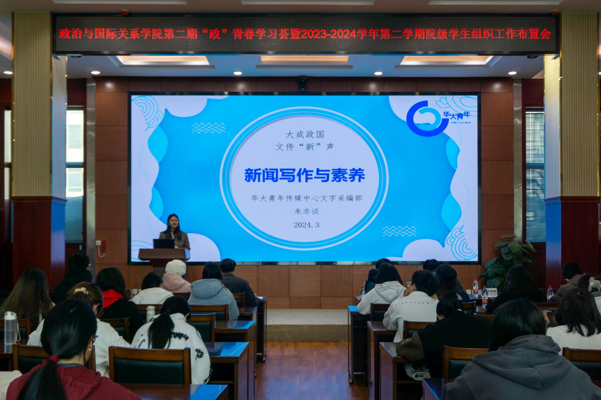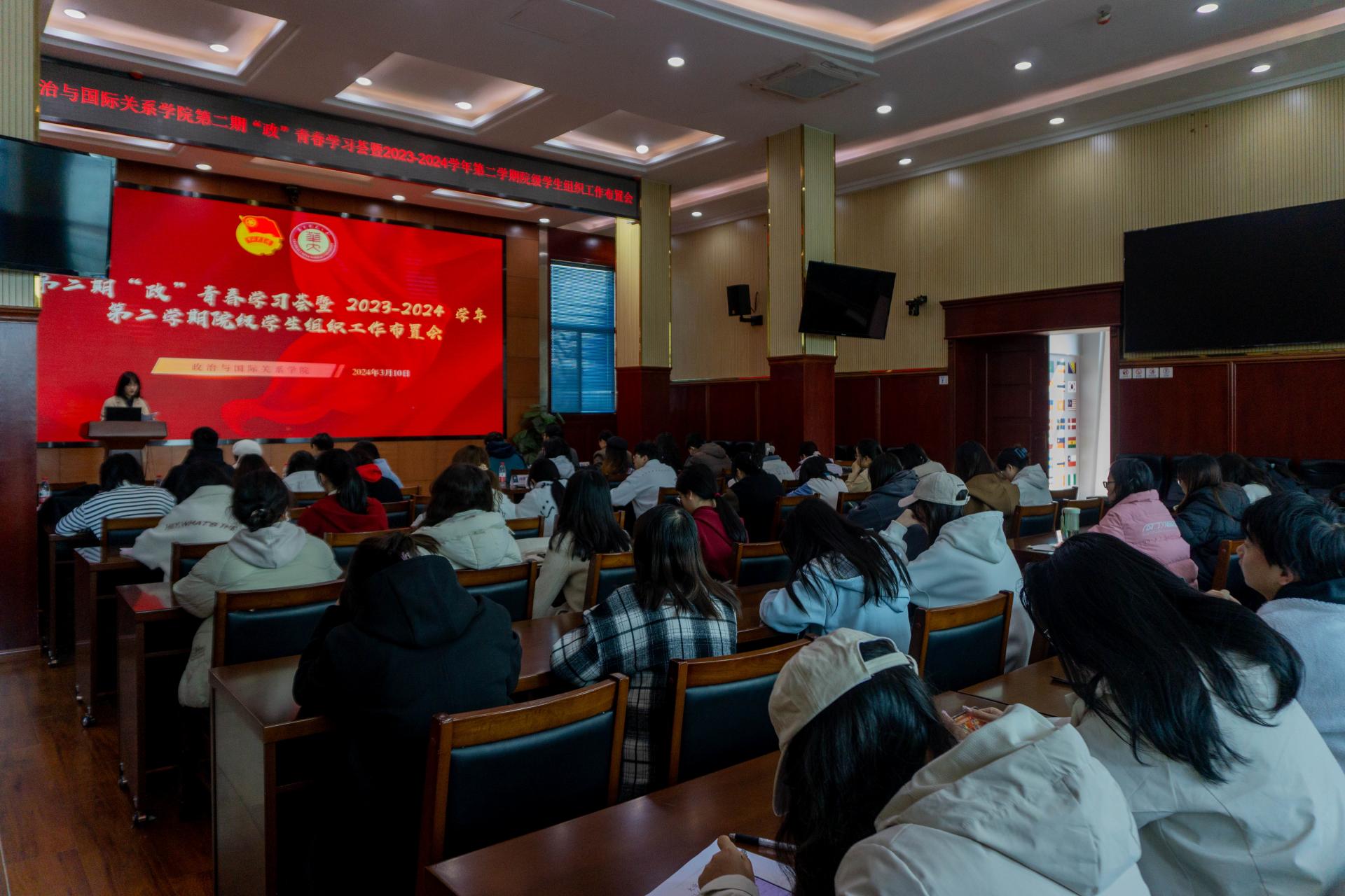 华大青年讯(通讯员 蒋佩霈)3月10日,政治与国际关系学院第二期“政”青春学习荟暨2023-2024学年第二学期院级学生组织工作布置会于文华公书林模拟联合国实验室举行。政治与国际关系学院团委副书记、本科生辅导员翁艾迪,政治与国际关系学院团委副书记、研究生辅导员胡泽文,华大青年融媒体中心文字采编部负责人朱亦谈出席活动,院级学生组织团学骨干参加。