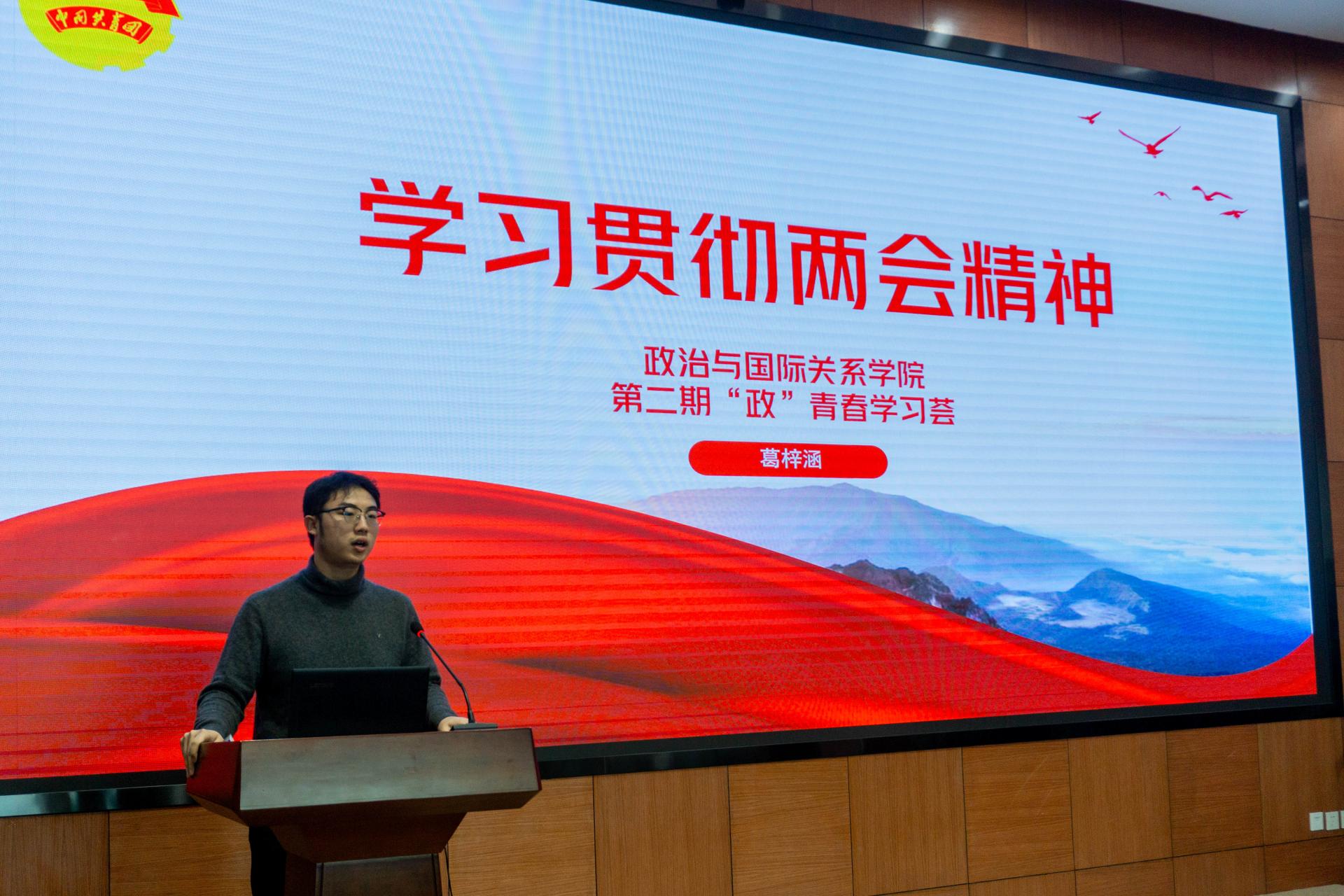 政治与国际关系学院团委副书记(学生)葛梓涵就“学习贯彻两会精神”进行专题领学。他以回顾习近平总书记全国两会温馨瞬间为依托,领学习近平总书记在全国两会期间的重要讲话精神,强调全体团学骨干要认真学习贯彻两会精神,学习榜样力量、争做时代青年,为中国式现代化贡献青年力量。