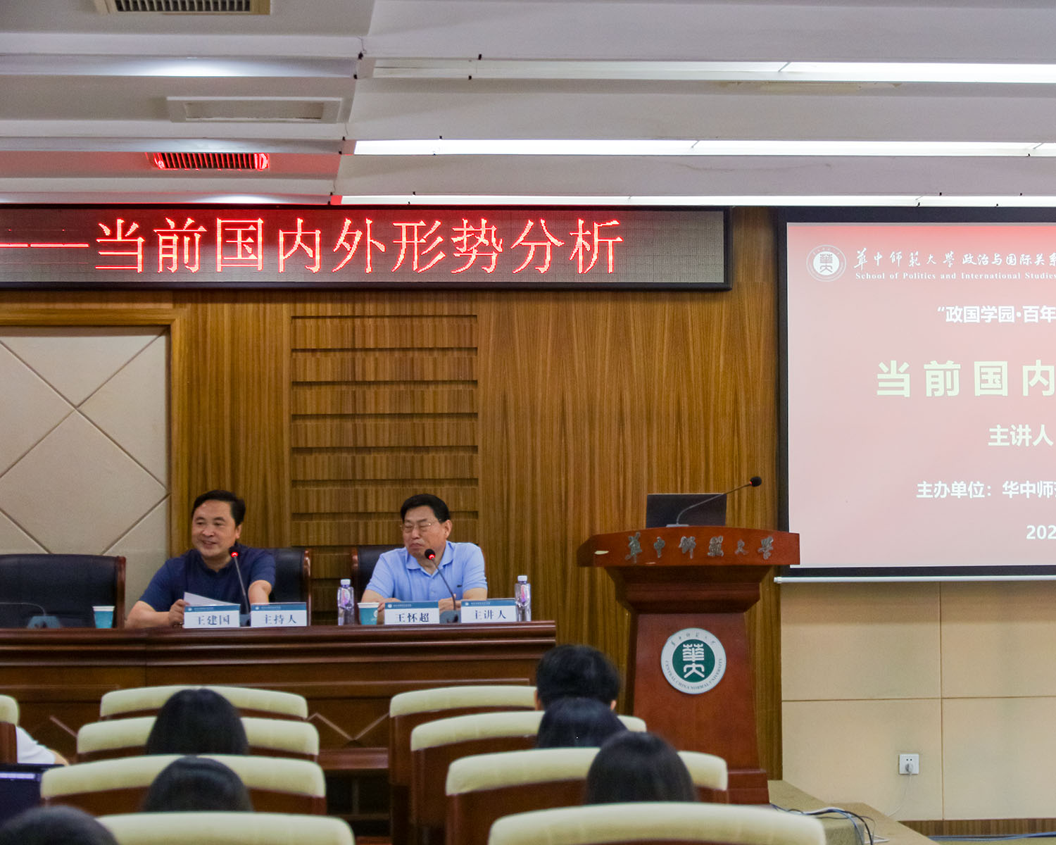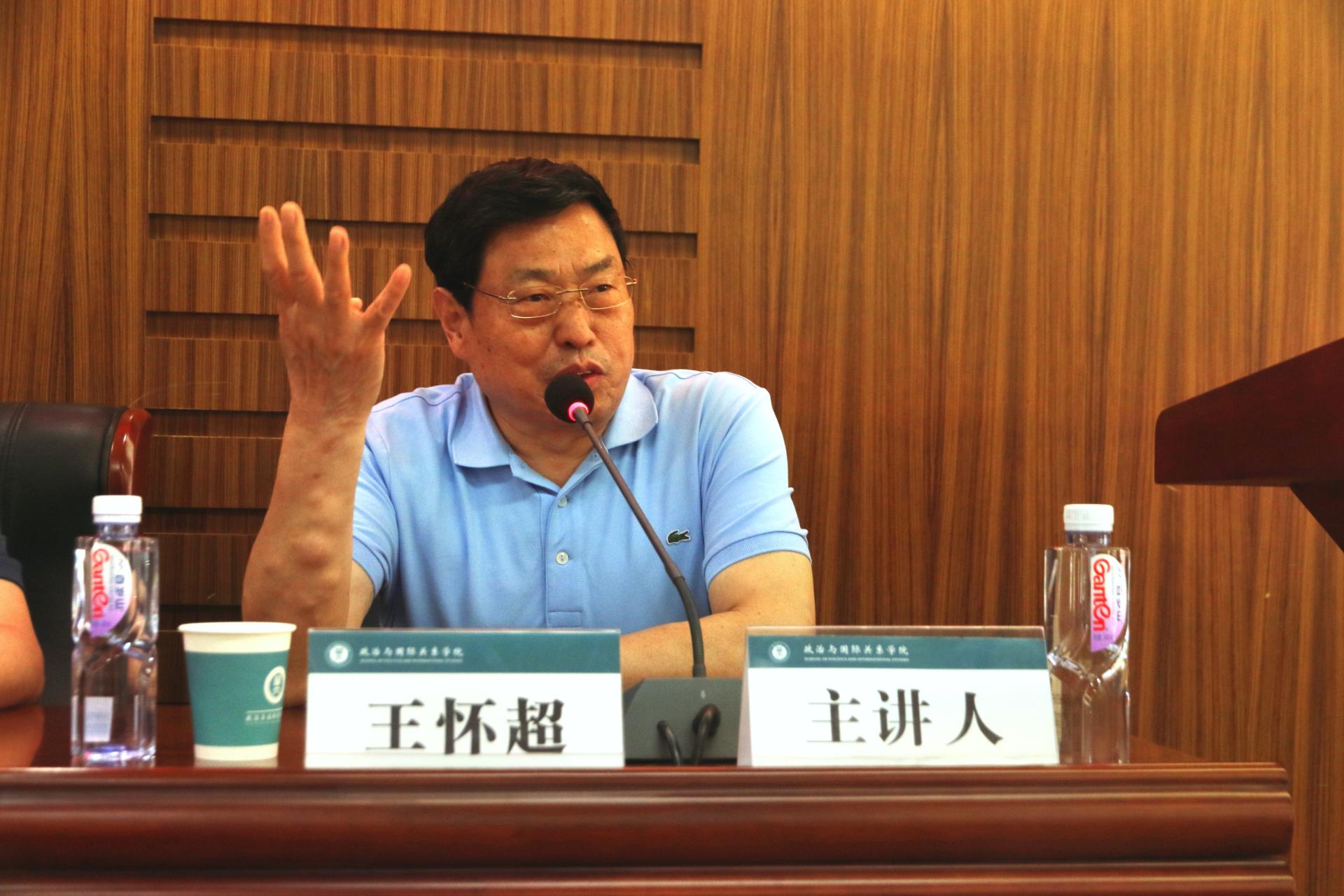 王建国代表全体与会人员欢迎王怀超。他提到,王怀超一直致力于社会主义理论、社会发展理论、社会改革理论的研究,先后出版了《社会主义发展阶段研究》《当代中国的社会主义改革》《社会发展理论研究》等多部著作,是教师与学生学习的榜样。本次讲座以“当前国内外形势”为中心,旨在探索新形势下如何培养适应国内外局势、拥有国际视野的青年人才。