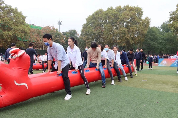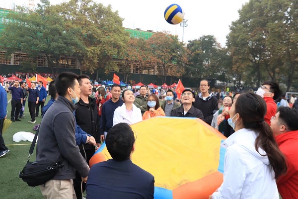同时,选手们通过喊拍子的方式来控制团队垫球的节奏,随着口号,比赛进入白热化,数统学院的每一名参赛选手在垫球过程中都扎稳马步,紧盯充气大鼓上的排球,场外的加油呐喊声逐渐热烈。在选手们的默契配合下,数统学院教职工队完成了比赛。