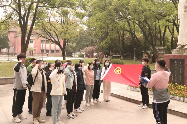 离开校史馆,站在恽代英雕像前,同学们展开鲜艳的团旗,庄严肃立。优秀共青团员郑昊天领誓,带领大家重温入团誓词,牢记初心使命,凝心聚力再出发。宣誓结束后,参观成员程佳薇说:“作为新时代的共青团员,我生逢盛世,更当自强。参观完校史馆,深刻感受到前辈们披荆斩棘的艰苦奋斗,担当责任,砥砺前行,我辈义不容辞。”