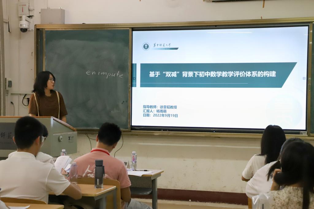 第五组和第七组均从师范生的角度出发,结合时事,分别以数学素质教育和数学教学评价体系为题进行论述。第五组的团队从自身经历和切身感受出发,归纳出三种教学模式,在社会实践基础上,对数学启蒙教育多元化途径进行探索。第七组选取初中数学教学评价体系为切入点,尝试构建“双减”政策下的新的评价量表。答辩人杨雨萌向大家介绍初稿设计,一轮试点测试,二轮修改完善,及相关推广成果。新量表中,对以往信息素养和人文关怀相关评价缺失的补充获得好评。