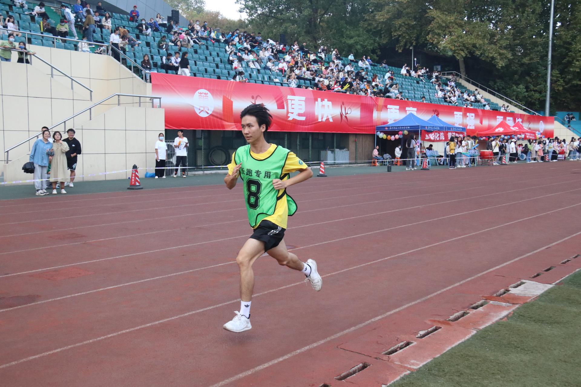 随着发令枪一声巨响,运动员犹如离弦之箭弹射而出。有力的大腿迈出矫健的步伐,洁白的号码簿随风轻轻地飘动,透明的汗滴在阳光下绽放绚丽的光彩。每每经过弯道,数统学院的跑旗志愿者就挥舞着鲜红的旗帜,同运动员一起奔跑,为他们加油助威。志愿者竭尽全力的呐喊,观众们振臂疾呼的吼声,连同血红色牛皮大鼓震耳欲聋的轰鸣,融汇成运动场上最悦耳的交响乐曲。