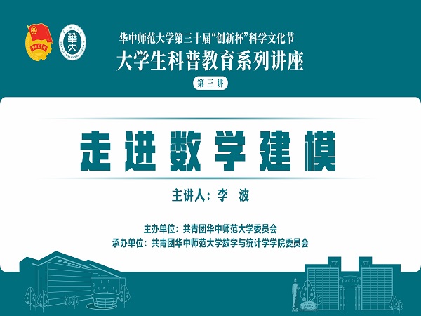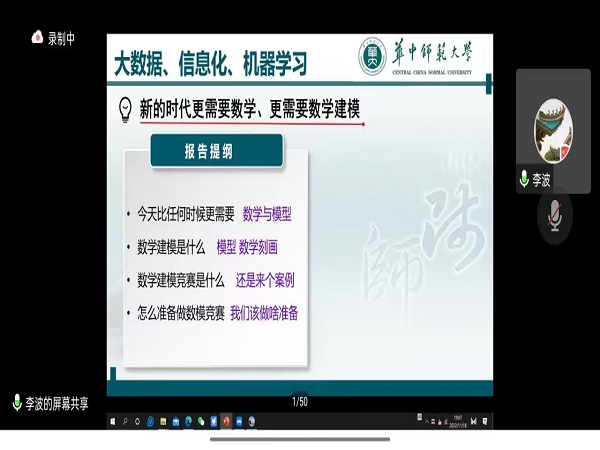 华大青年讯(通讯员 王姚楚凡)为进一步整合科创育人资源,营造积极、健康、向上的校园科技文化氛围,按照“搭建平台、典型引路、积极引导、重在普及”的思路,充分发挥学校全过程、全方位的育人功能,培养学生的科创意识和实践能力,11月18日晚,由数学与统计学学院(以下简称“数统学院”)承办的华中师范大学第三十届“创新杯”科学文化节大学生科普教育系列讲座第三讲——“走进数学建模”讲座于线上举行。本次讲座由数统学院统计系系主任李波主讲,数统学院党委副书记田俊、团委书记武靖出席本次活动,团委副书记龙星宇担任主持人。