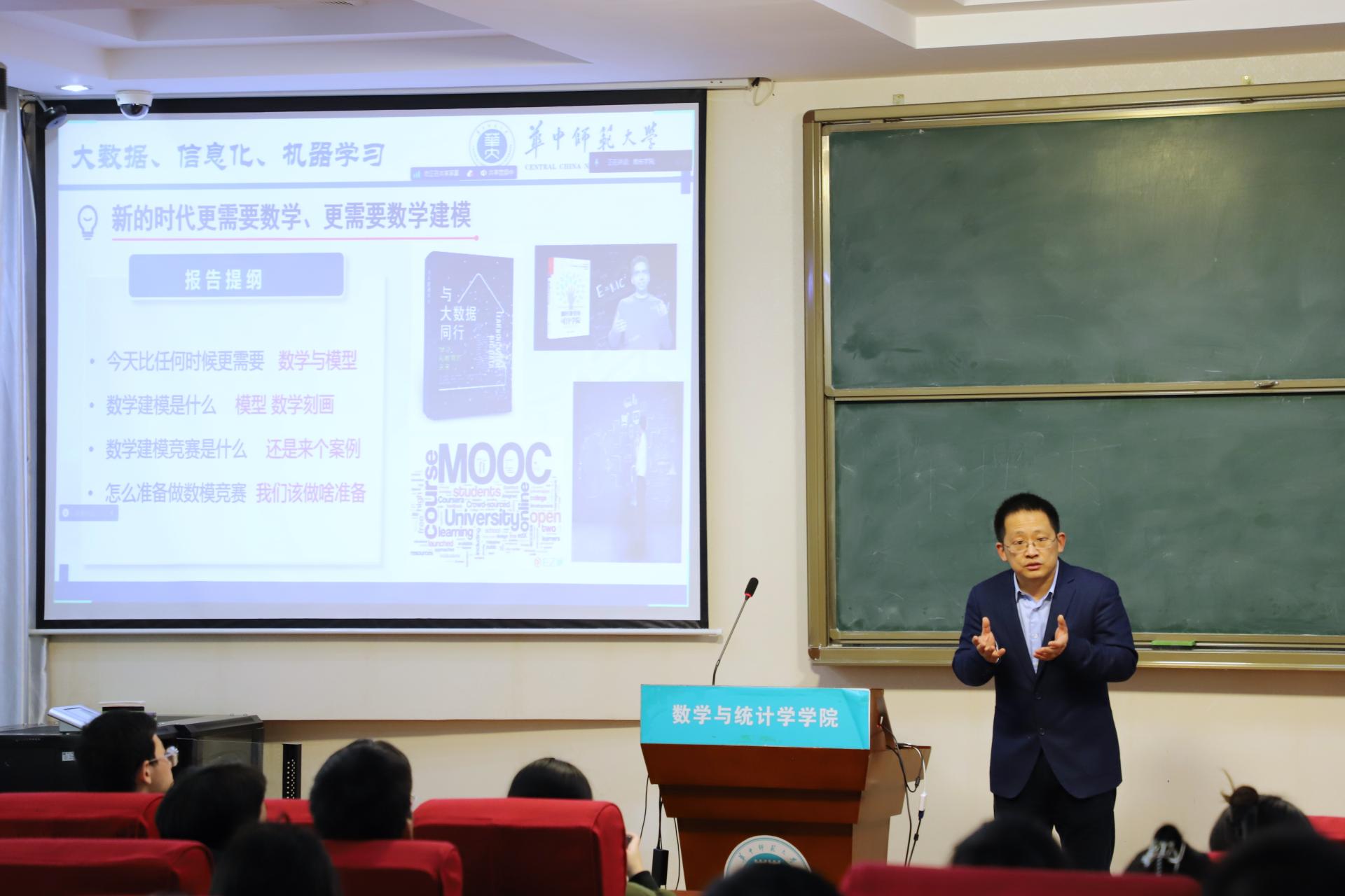 华大青年讯(通讯员 李佳欣 韩泊垣)为营造积极、健康、向上的校园科技文化氛围,帮助同学们感悟数学之美,体验数学知识与多学科的交叉融合与应用,熟悉数学模型在实际生活中的应用,12月1日下午,由数学与统计学学院(以下简称“数统学院”)承办的华中师范大学第三十一届 “创新杯”科学文化节探理求真、立德树人大学生科普教育系列讲座第一讲——“走进数学建模”讲座于6401、6201举行。本次讲座由数统学院统计系系主任李波主讲,数统学院党委副书记杨可军、团委书记武靖、团委副书记龙星宇出席本次活动,本次活动由武靖主持。