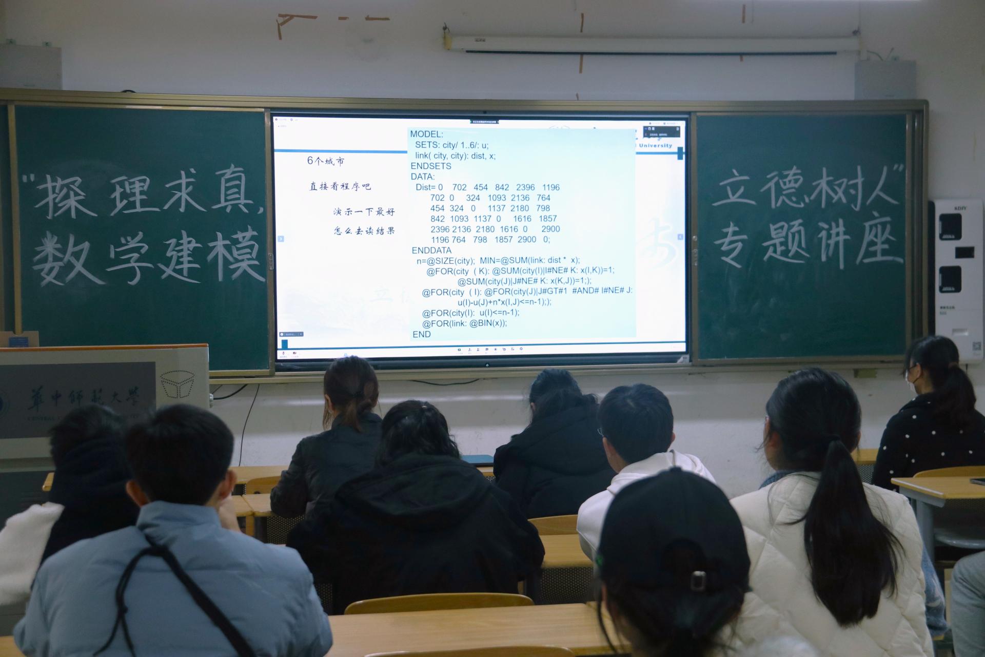 数学建模与实际问题密切相关。李波给同学们详细介绍了旅行商问题和邮递员问题,以及如何解决关于纸片排列的问题。带领大家思考数学建模思想在具体问题中的运用,研讨数学建模方法,帮助同学们更加细致的了解建模过程,培养数学思维。在讲述过程中,同学们认真思考,分会场的同学们也积极参与讨论,表现出对数学建模浓厚的兴趣。