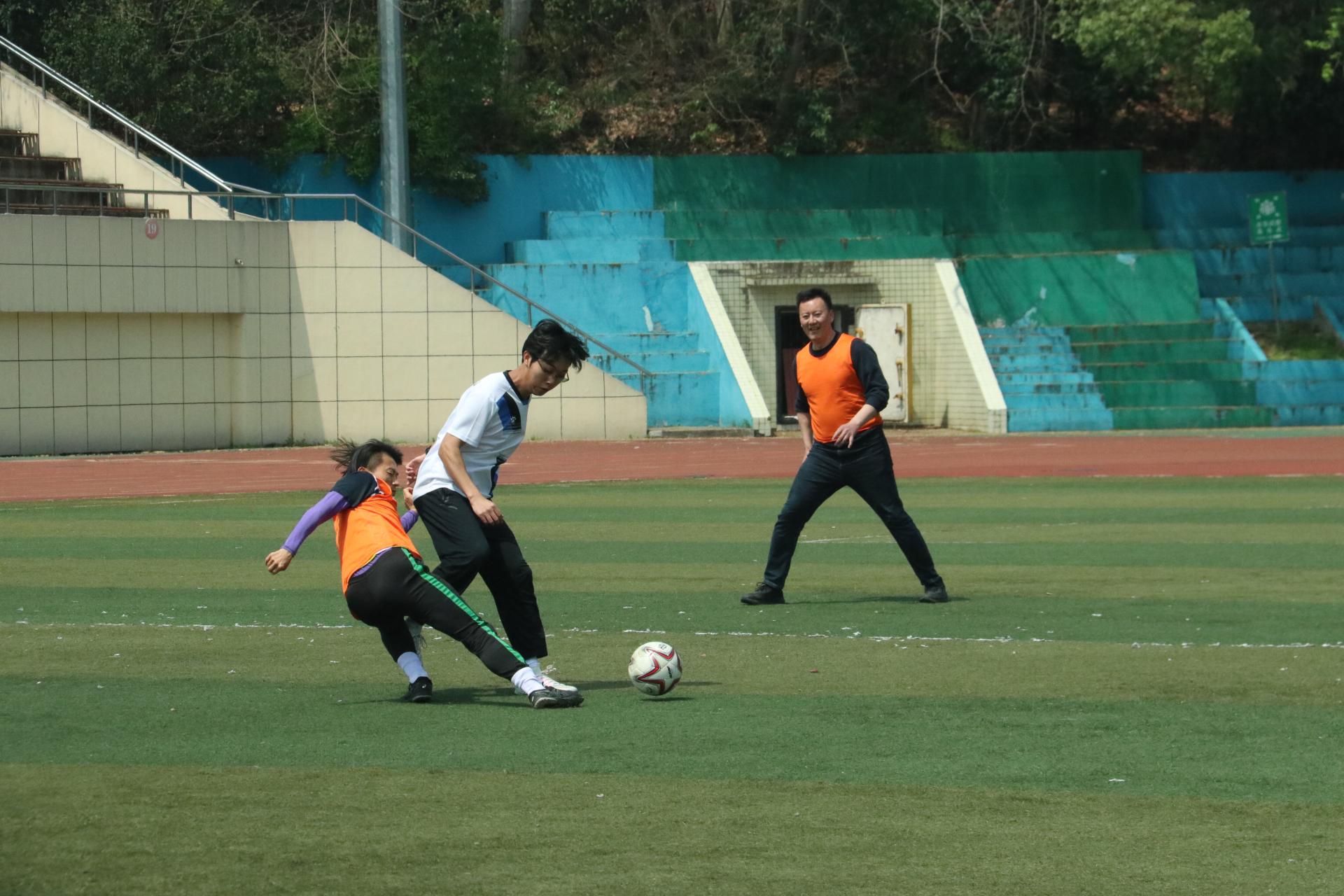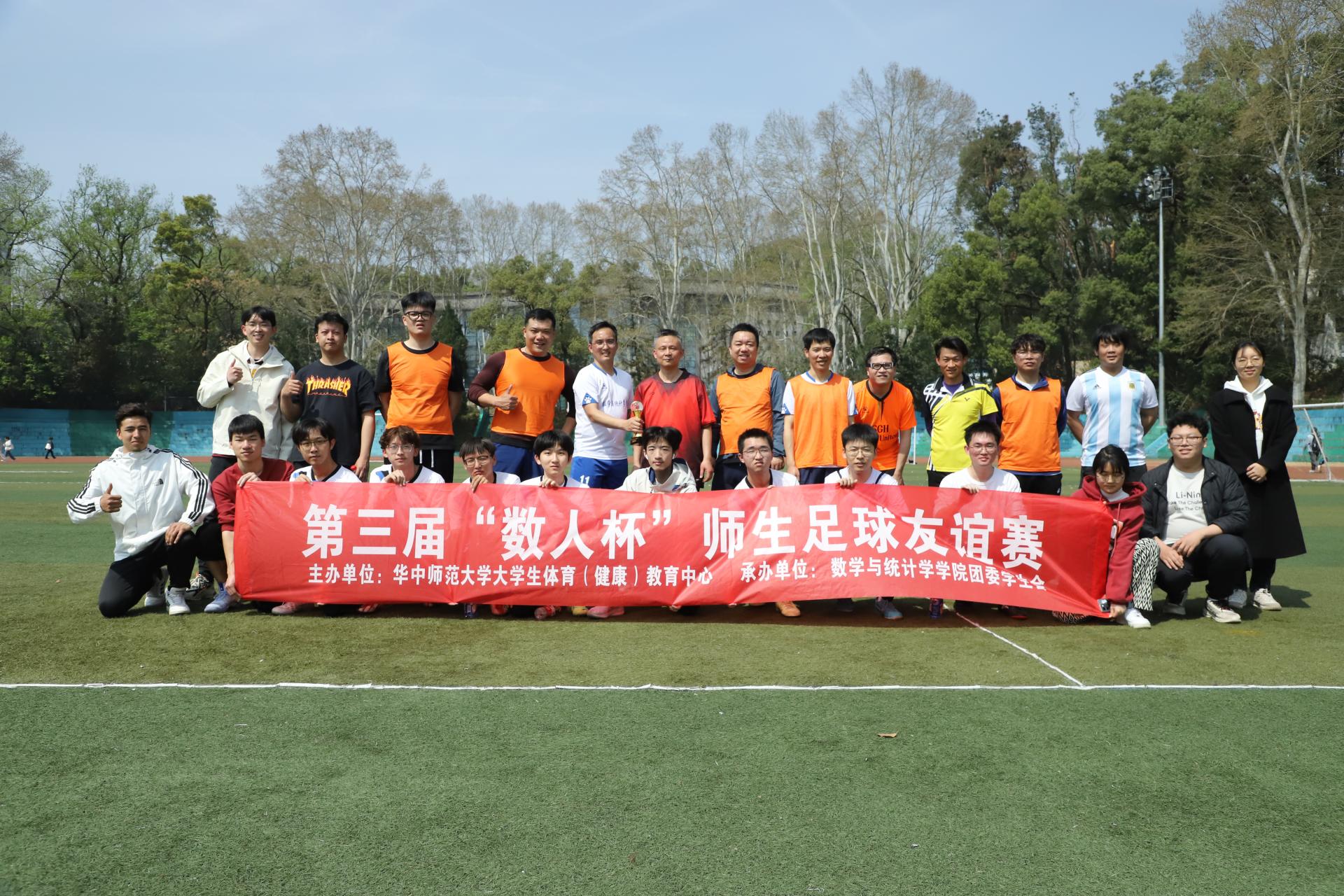 华大青年讯(通讯员 梁云)为发挥体育育人的功能,加强师生之间的友好交流,促进学生全面发展、增强综合素质,3月26号中午,华中师范大学大学生体育(健康)教育中心、数学与统计学学院(以下简称“数统学院”)团委学生会于佑铭体育场举办第三届“数人杯”师生足球友谊赛。经过激烈角逐,教职工队最终赢得比赛。
