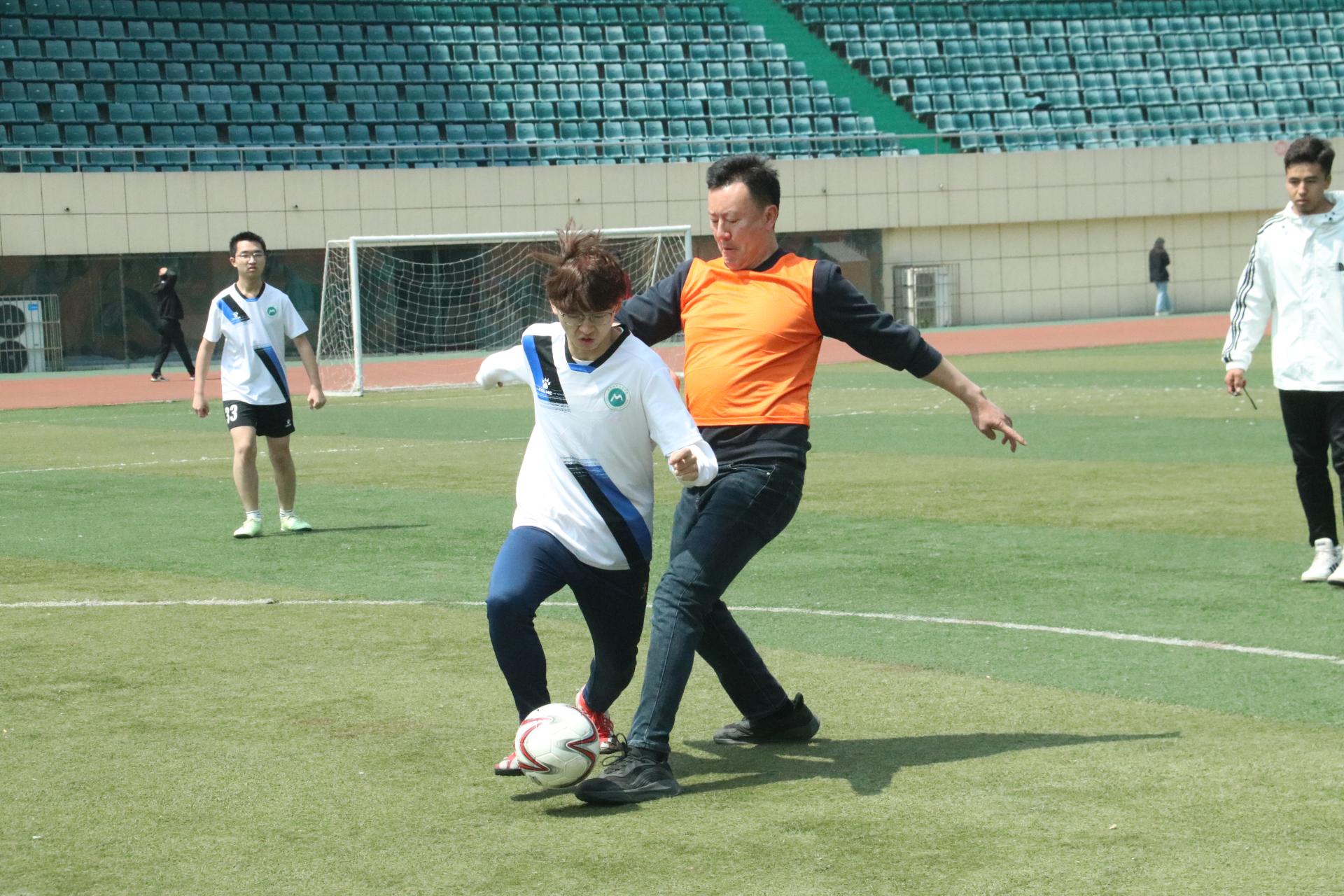 比赛前,双方球员提前入场热身,讨论比赛战术。随着裁判一声哨响,球员迅速进入状态。学生队球员杨云潇抓住机会,踢进全场第一球。随后,在教职工队的默契配合下,周彦老师射门成功,拿下一分,追平比分。在双方的严防死守下,战况一度胶着,上半场双方以1:1的比分结束。