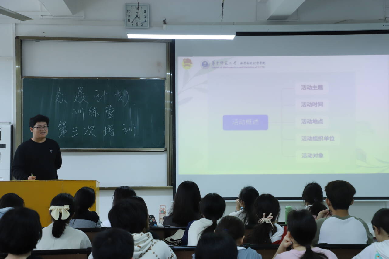 华大青年讯(通讯员 马瑾茹 刘朕铨)4月29日中午,数学与统计学学院(以下简称“数统学院”)团委、学生会“众焱计划”训练营第三次团干培训于6201教室举行,本次培训旨在帮助同学们了解策划书的内容要求和撰写细节,提升策划撰写能力。培训由数统学院学生会主席团成员郭天宇主讲,团委、学生会全体负责人参加本次培训。