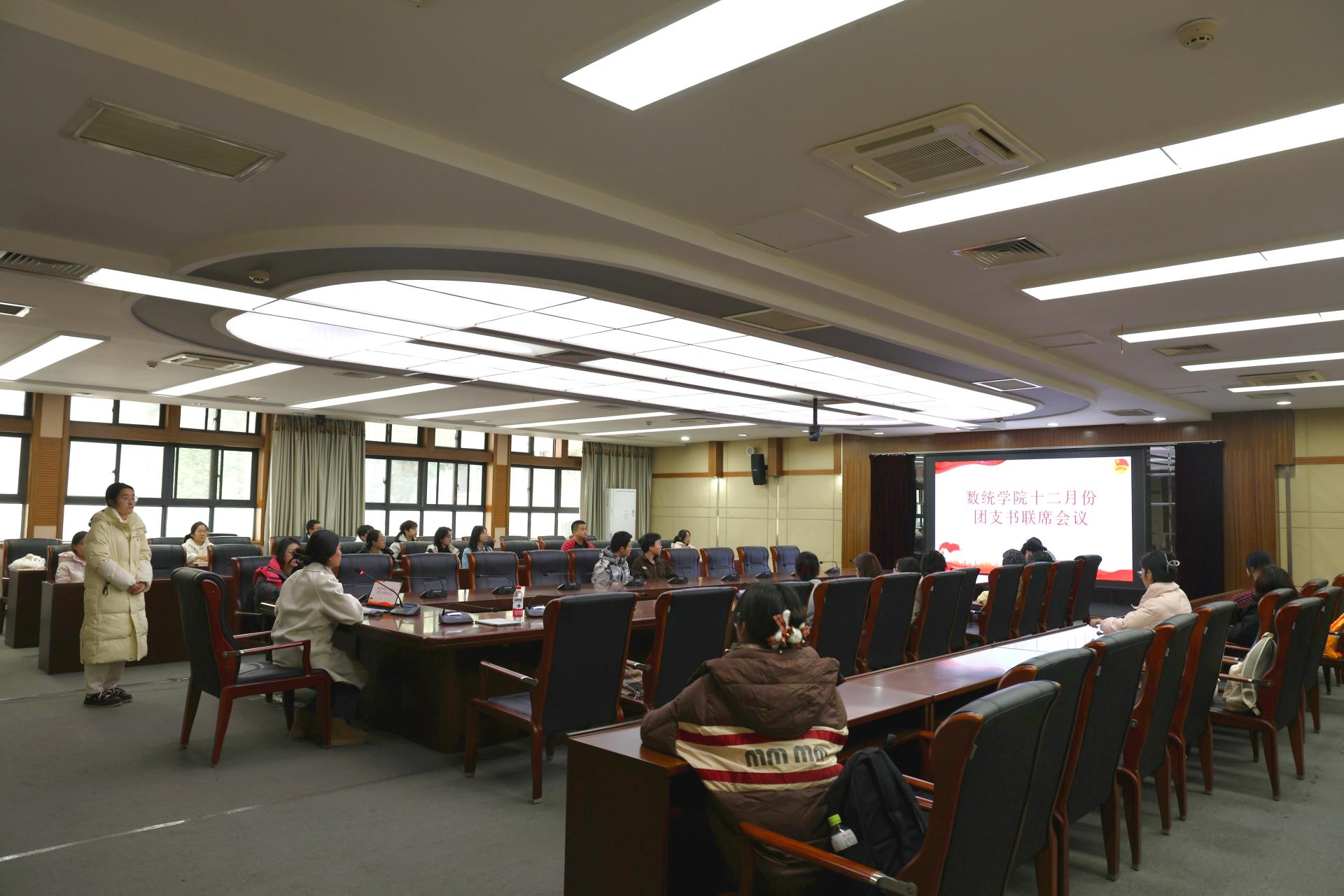 华大青年讯(通讯员 王淼 孙绍宸)12月9日中午,数学与统计学学院(以下简称“数统学院”)12月份团支书联席会议于逸夫国际会议中心二楼会议室举行。数统学院团委副书记(学生)颜少茹出席本次会议,2023、2024级各支部团支书参加会议。本次会议由团委组织部助理营员卢雍雍主持。