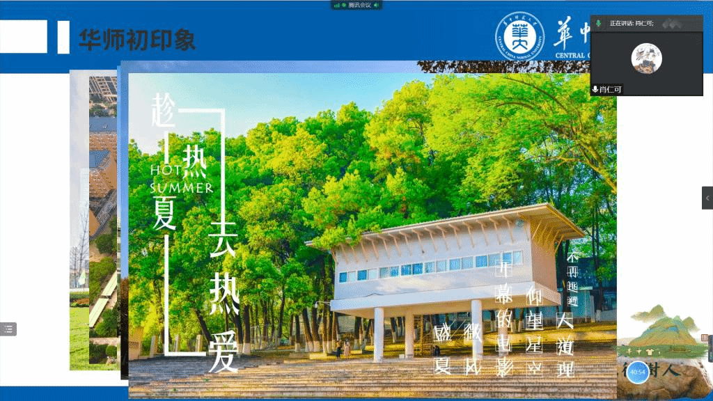 然后,化学英才班的谢雨航从学习和科研、生活和假期、成长和挑战、化学英才班四个方面出发,向中学的同学们分享她的大学生活。她谈到了她对于大学学习的认识、科研的日常、多彩的校园生活以及个人的成长经历,最后向中学的学弟学妹们介绍了化学英才班,并寄语学弟学妹,欢迎他们今后来到华中师范大学,学在华大、梦想起航。