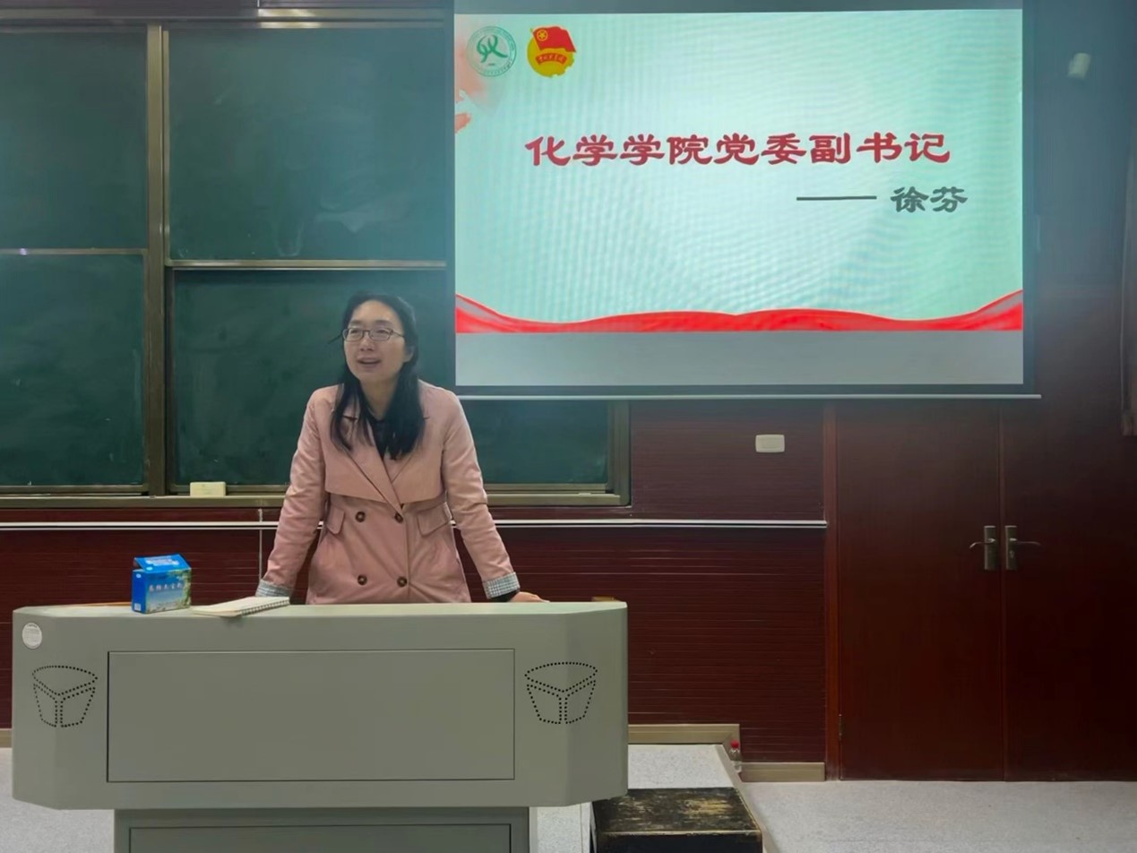 最后,化学学院党委副书记徐芬发表讲话。徐芬从10月5日举办的化学学院建院20周年庆典暨学院校友会成立大会展开,通过介绍化学学院优秀校友表达了对2023年华中师范大学双甲子校庆的期待。在讲话中她提出,所有学员应顺应新时代需求,以优秀校友为榜样,不断提升自我能力,明确“人才培养、立德树人”的要求。在党的二十大即将召开的背景下,她从三个方面鼓励学生骨干成为引领时代的标杆,并做好配合学校、服务广大青年的工作。她提出,学生骨干首先要有强烈的主人翁意识,有一份热发一份光,把责任意识落到实处;其次,学生骨干应具备主动思考的能力,为团队注入新的内涵;最后,学生骨干要有实干精神,应扎扎实实做好每一件事情从而有所作为。讲话的结尾,她祝福同学们在大学里能够收获更多的成长。