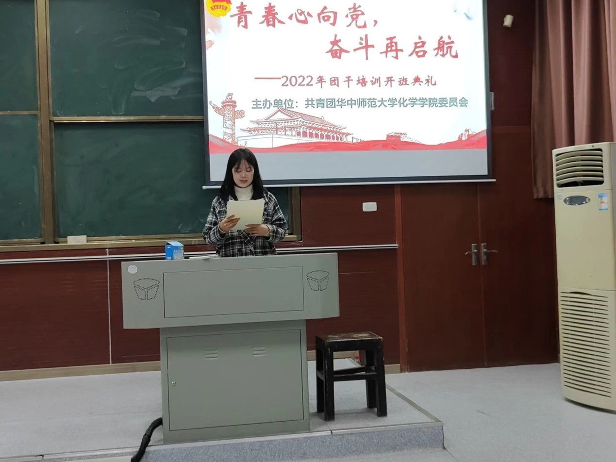 华大青年讯(通讯员 杨礼晗)10月7日晚,化学学院2022年团干培训开班典礼在逸夫化学楼举行。本次活动由共青团华中师范大学化学学院委员会主办,由化学学院团委组织部承办。活动以“青春心向党,奋斗再起航”为主题,旨在详细介绍化学学院团委学生会部门职能、分工,给各部门学员提供一个共同学习、共同进步的机会。出席此次活动的嘉宾有化学学院党委副书记徐芬、团委书记马莹、团委副书记武双欣。化学学院2022级红石榴团学骨干训练营学员,红石榴提升组学员,2022级年级干部、班级干部,2021级部分年级干部、班级干部参与了此次开班典礼。活动由化学学院团委组织部负责人郭诗赟主持。