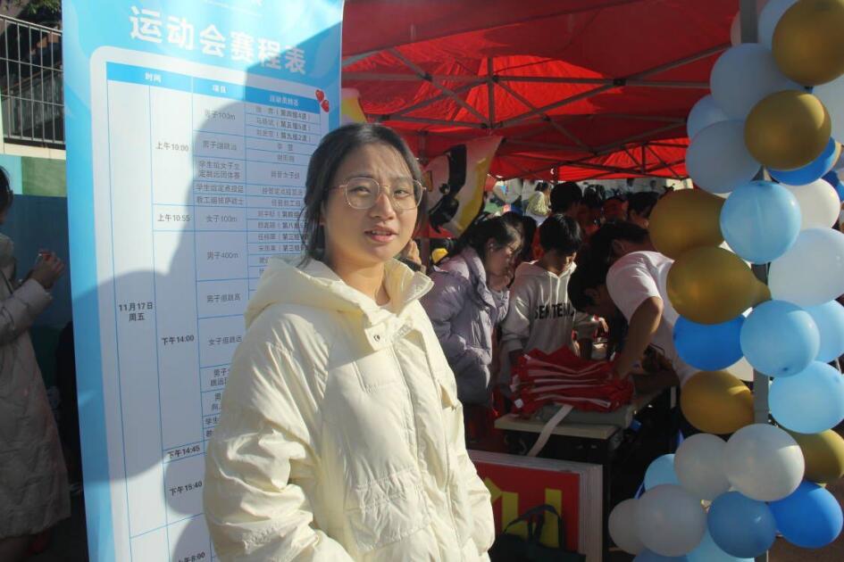 “这是我第一次参加校运会志愿者活动,在田径场馆的工作虽然忙碌紧湊,但充实有意义,忙碌在每天奔波穿梭于运动场,充实在帮助他人的过程中也提升着自己。”作为组织部的志愿者,杨碧君和同伴的主要任务是清点和分配好每天的物资,统筹整个经管学院的比赛项目安排。在本次校运会志愿活动中,杨碧君结识了很多志同道合的伙伴,她在工作中践行着青年志愿者活动所倡导的团结友爱、助人为乐的精神,在忙碌中获得了成就感。在今后,杨碧君也将继续参加各类志愿活动,在服务和奉献中提升自我、不断成长。