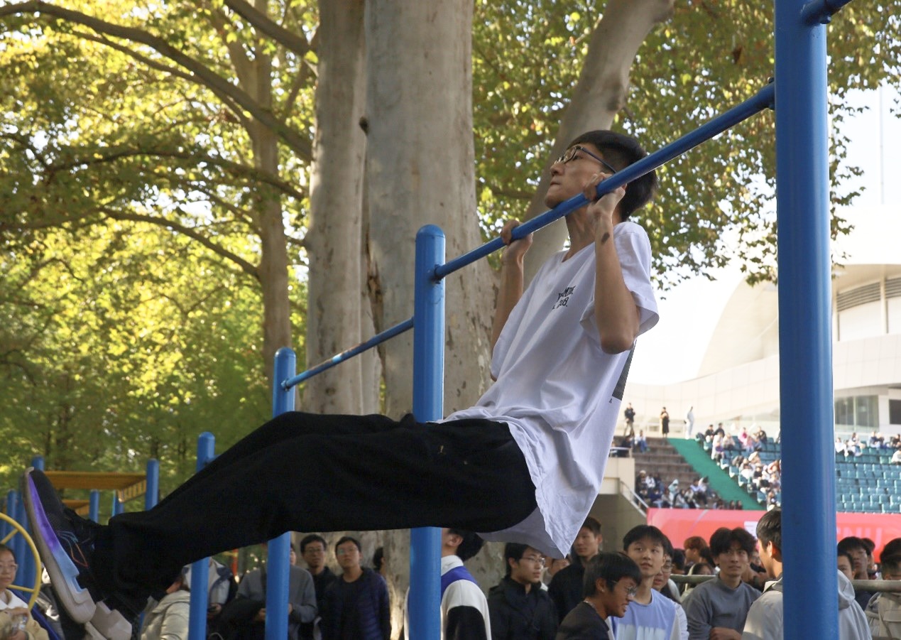 相较于跳高和跳远对于爆发力的考验,引体向上是对毅力的磨练。佑铭体育场边上的大树远高于引体向上的横杆,但却无法与引体向上运动员们高涨的热情相比。跃起似猛虎,经管健儿们汇聚全力,撑起全身的重量,一次次跨越杆的高度,一次次接近天空的高度。背负树荫下的汗水,在阳光下绽放光芒。在经管健儿们的努力下,经管学院取得了引体向上团体第三名的好成绩。