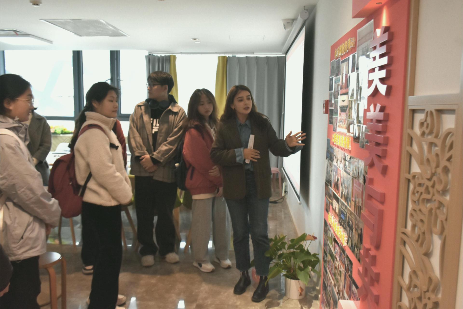 热米拉带领与会人员参观了华大民族团结进步之家。共有共享的文化符号、美轮美奂的民族文化装饰设计吸引着参观人员的目光。大家沉浸式感受华大民族团结进步之家,深入参观这个极具创新性和辨识度的育人阵地,同时对学校民族团结进步教育工作的举措和丰富成果有了进一步地了解。