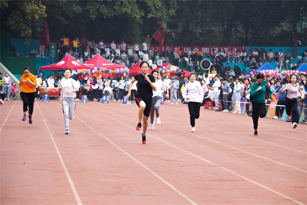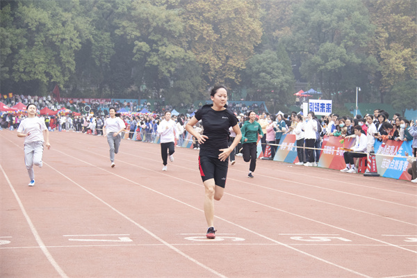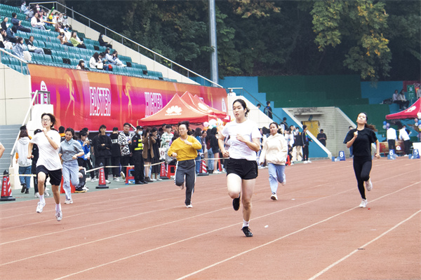 作为文学院四位参赛者中第一位登上赛道的选手,张雅雯首先在起点处进行热身运动。在起跑时可以看出她有着不错的爆发力,速度在小组中领先,接后不断地拉大与其他选手的距离,最终以较大优势拔得头筹。这为文学院的其他选手开了一个好头。