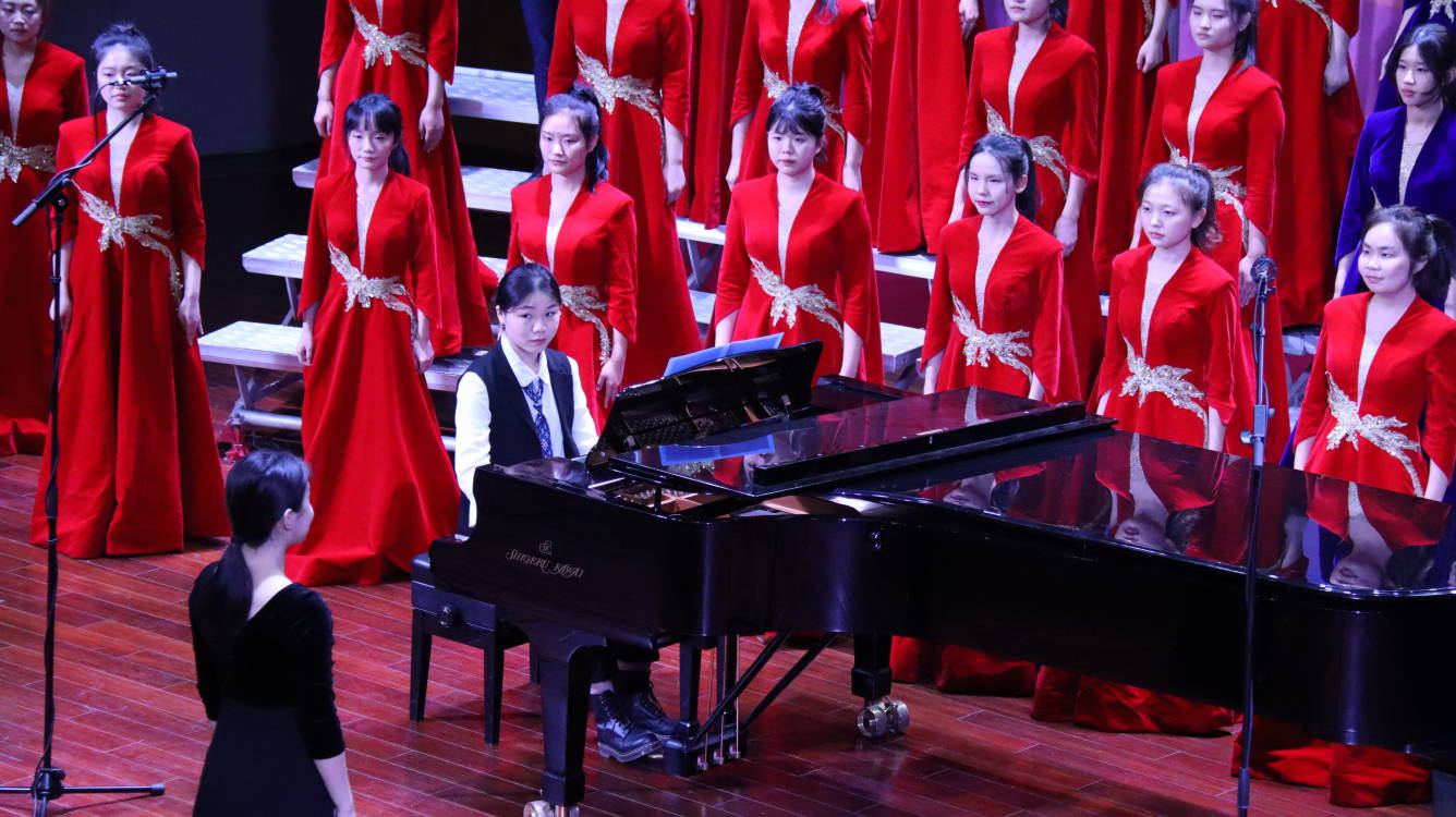 光未然文化自信合唱团坚守成立的初衷,传承延续光未然先辈和百年文院的精神风貌,弘扬红色旋律,唱响青春之歌,在本次“天空杯”决赛中选择了《五月的鲜花》这首由光未然作词,阎述诗作曲,展现抗日救亡精神的歌曲。随着钢琴音符的跳跃,合唱团也高声唱出:“五月的鲜花开遍了原野,鲜花遮盖着志士的鲜血,为了挽救这垂危的民族,他们曾顽强的抗战不歇。”合唱团成员们的歌声壮阔嘹亮、悦耳动听,深深地打动了在场的观众们。
