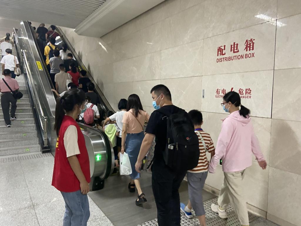 恰逢国之华诞,十一假期黄金周第一天,梨园地铁站人头攒动。志愿者们来到地铁站内,在车控室内根据工作人员指示签到并穿上志愿服,紧接着听从工作人员安排,分别被分配到进出站口、扶梯口、售票处等不同岗位,简单熟悉站内方向与出口后,志愿活动就开始了。