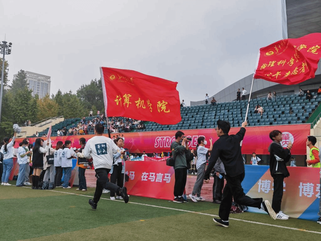 同样激动人心的还有为男子1500米加油的院旗陪跑活动。一声枪响,运动员们起步开跑,而另一边,举着印有计算机学院的院旗的同学,在跑道旁陪着运动员一起奋力向前冲,留下一道红色的虚影,嘴里还一直喊着,“计算机学院,加油!计算机学院,冲冲冲!”参加陪跑的学生肖朗奔在比赛结束的后激动地说:“很开心,在陪伴运动员的过程中,相当于自己也体验了这种感觉,不管运动员的成绩如何,这个过程确实很享受。这不是一个人的长跑,而是计算机学院的接力赛。”