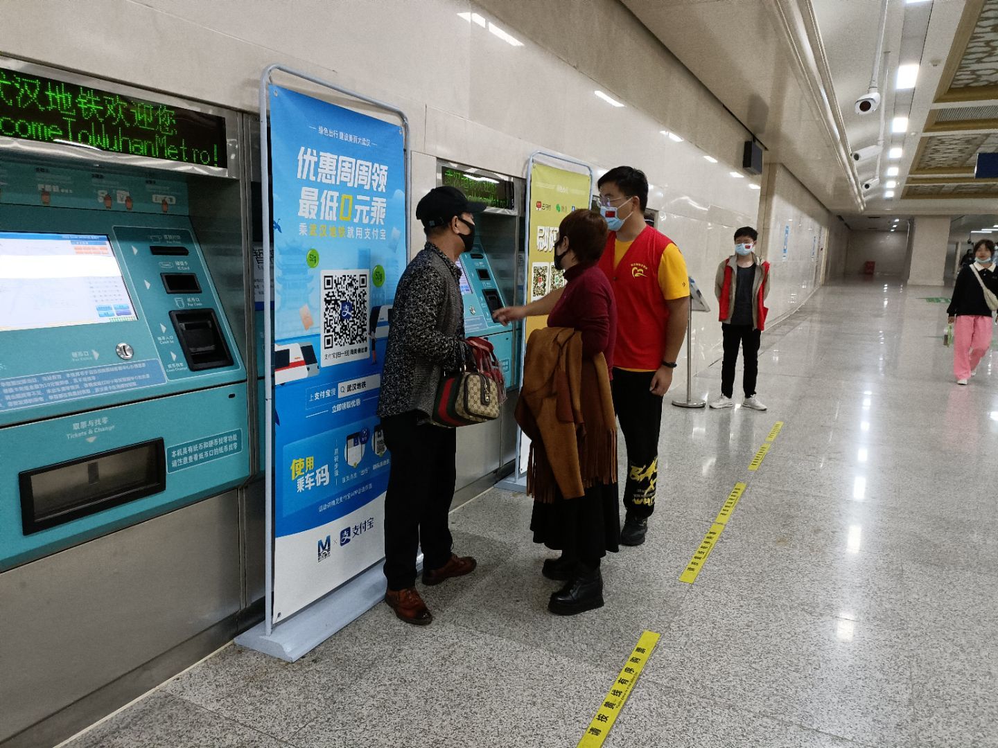 活动开始后,志愿者们迅速进入到工作状态。负责进出地铁口岗位的同学耐心指导乘客们扫描健康码,提醒乘客们保持一米的间隔距离。遇到没有佩戴好口罩的乘客,志愿者也会及时予以提醒,维护地铁站的疫情防控秩序。负责辅助购票的志愿者也热心帮助年长的乘客购票,耐心地为他们讲解乘车路线以及购票流程。