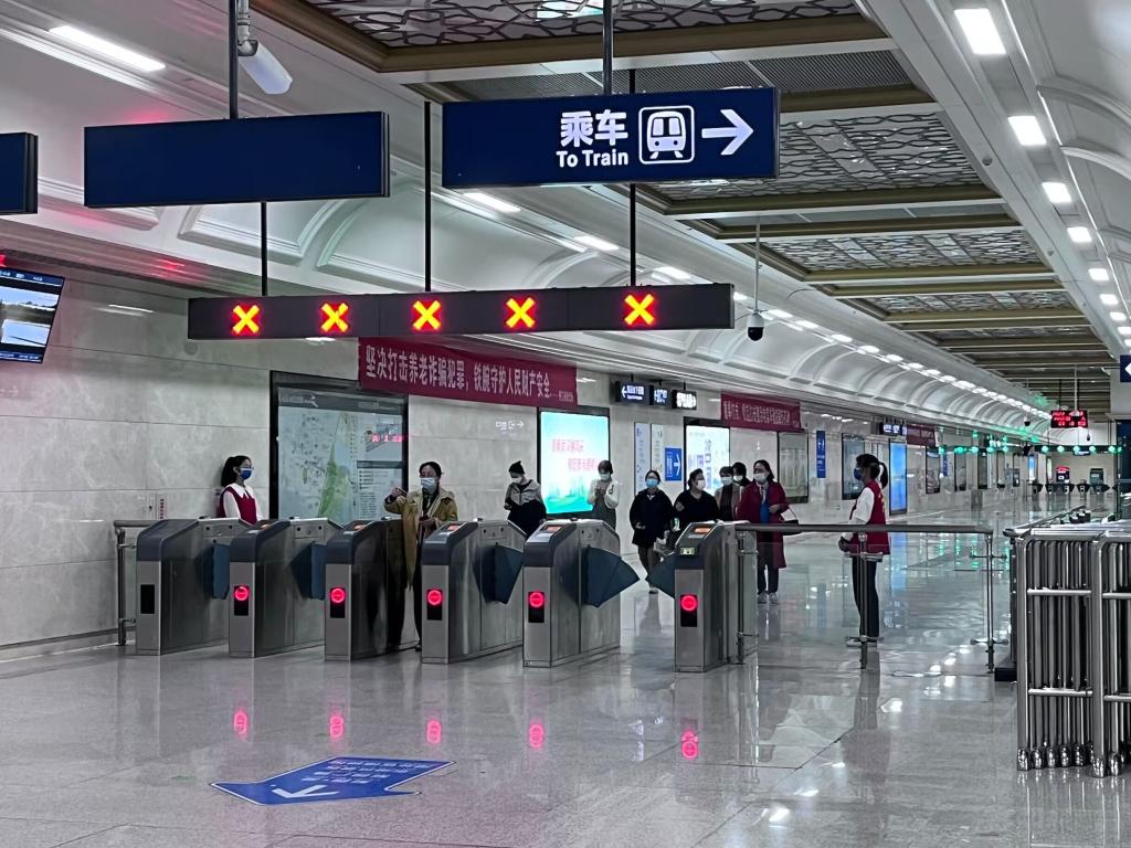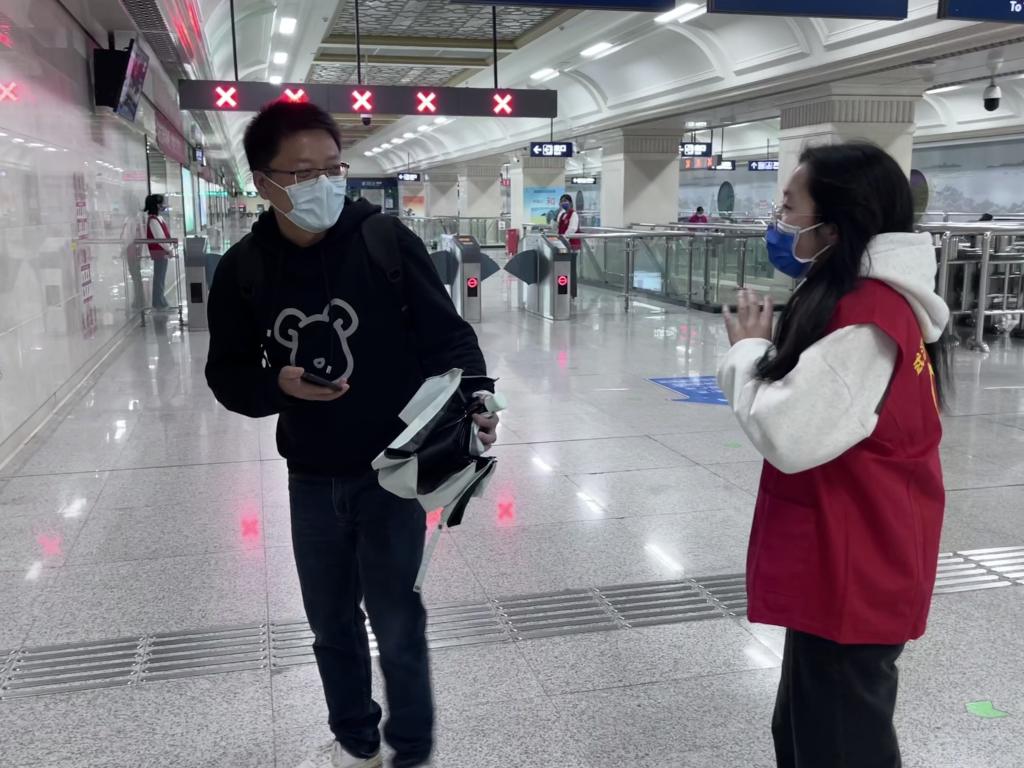 在闸机旁,志愿者引导乘客安全有序进出地铁口,维护现场秩序。当乘客遇到地铁卡余额不足或乘车码无法识别等情况时,志愿者会引导乘客前往总服务台,询问相关工作人员处理办法。对于无法扫码乘车需要购买实体票的乘客,志愿者会在一旁介绍具体交通路线,讲解购票流程。