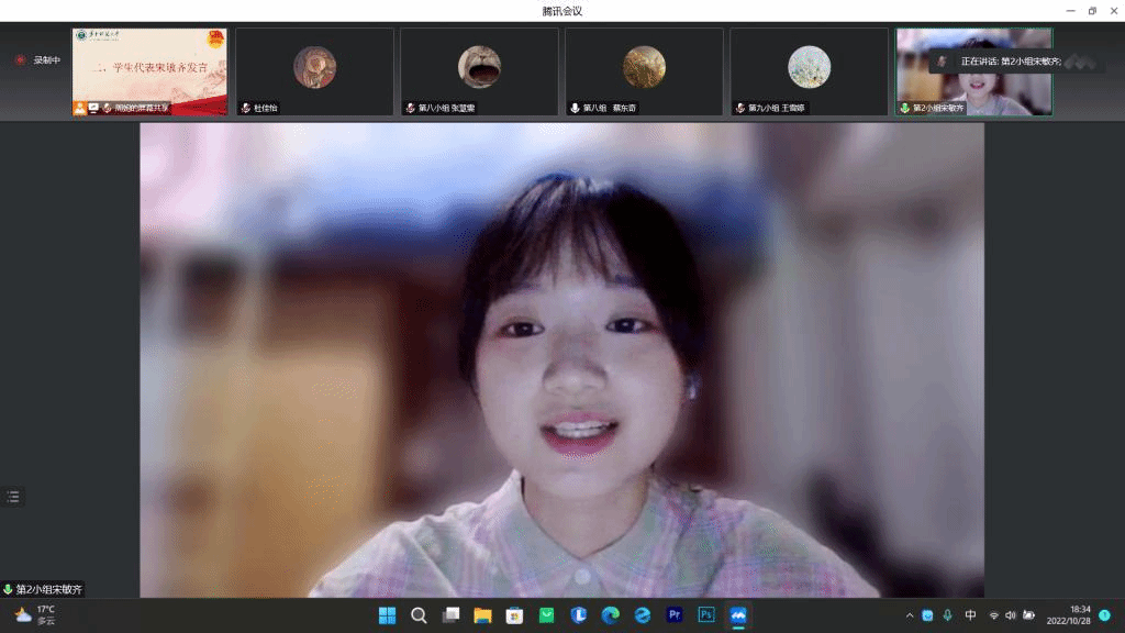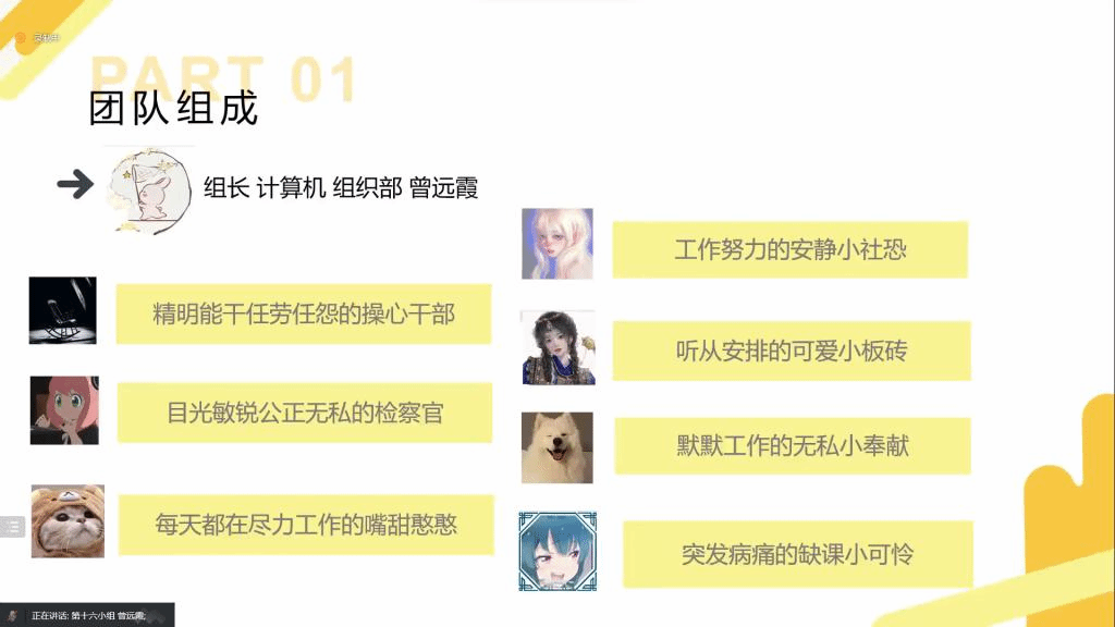 会议上半场结束后,团干成员分组进行小组汇报。借助短视频的形式,第一组组长成琦介绍了小组成员组成及成长之路。按照汇报要求,她依次讲述了小组在思想建设、团队建设、选定策划案主题、分工完成策划案及参加素质拓展等方面的历程。第十一组的汇报包括思想觉悟提高、小组组建、策划案撰写等方面内容,并进行了素拓心得及参训心得展示。汇报人颜润鑫表示:“就让花成为花,树成为树,我们成为我们,成为新时代的青年,一往无前,为星河满盅,为心念赤诚,为民族复兴的伟业。”