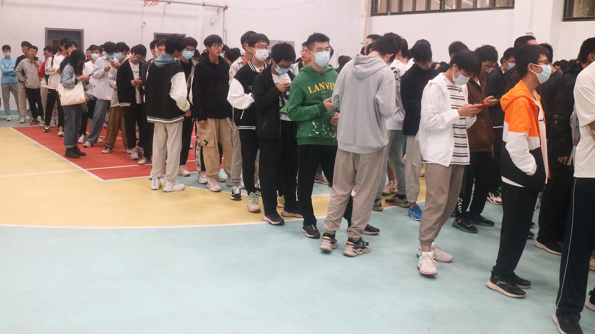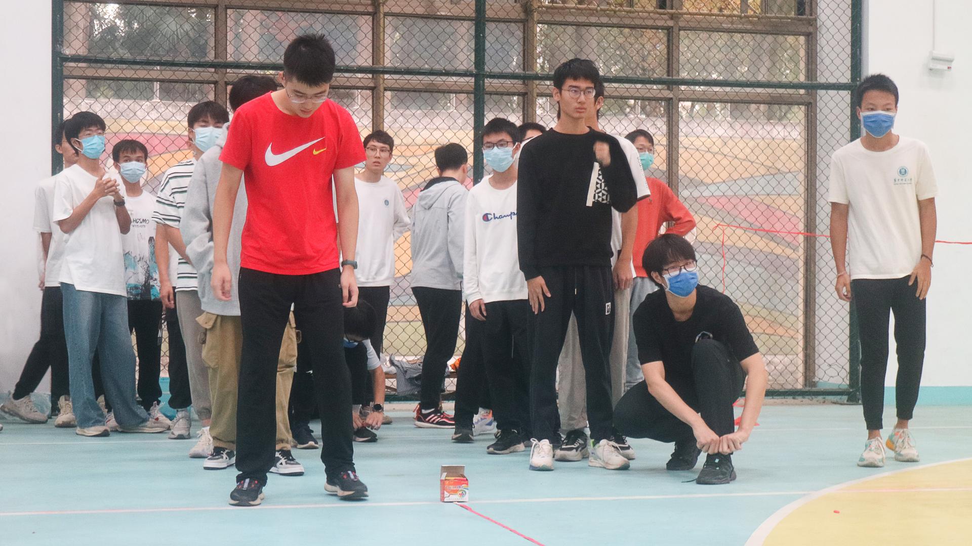 为迎接本次运动会,参赛选手们在十月中旬就开始了紧张且忙碌的训练,力争以饱满的精神状态参加比赛,取得满意的成绩。本次立定跳远比赛中,30名选手为一组,每位参赛者有两次试跳机会,取其中最远一次的成绩,起跳时脚尖不得踩到起跳线,所有选手的成绩叠加作为本组的最终成绩。比赛开始前,计算机学院立定跳远负责人曾万康、马燕伟分别带领两支队伍前往等候区进行热身检录。