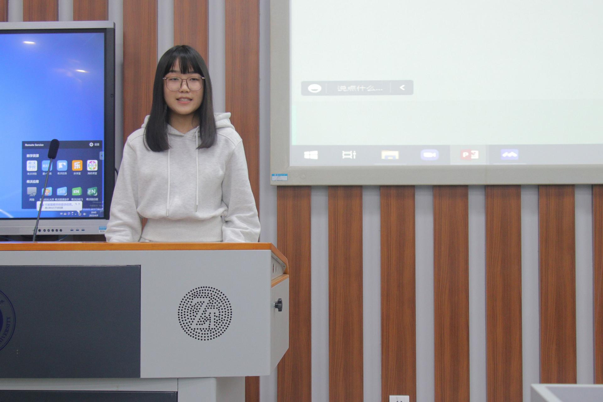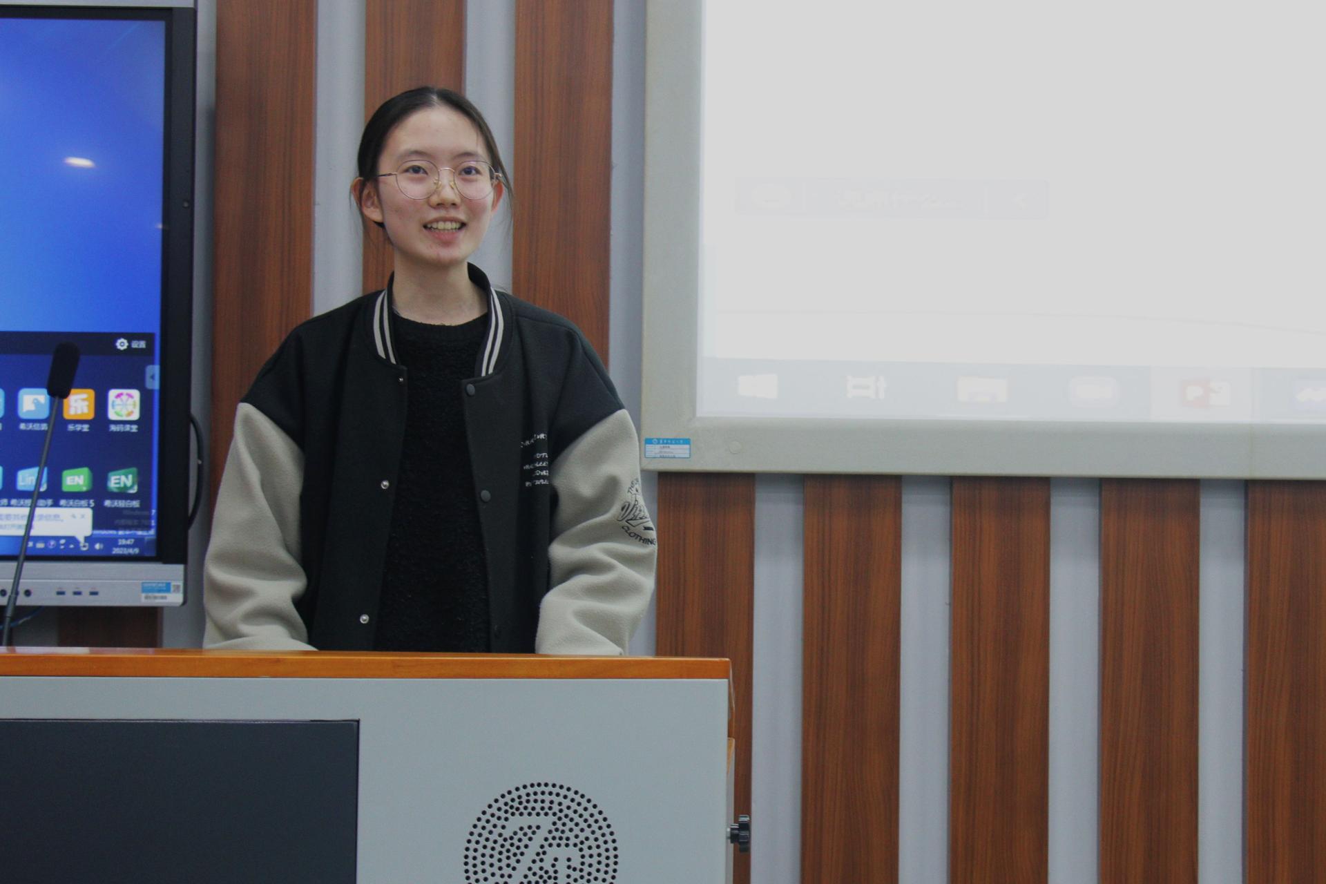 熊锦玟进行大英赛的经验分享。她简单地向2022级本科生介绍了大英赛的竞赛内容,主要包括大学英语学习阶段应掌握的英语基础知识和读、听、说、写、译五方面的技能。随后,她依次对于大英赛具体的题型进行了技巧分享。对于听力、阅读理解、翻译等题型,她表示寻找关键词是一个有效的方法。此外,她也提出一些注意事项,在平时应做好时间规划,在练习中不断调整,找到合适的做题顺序和节奏等。