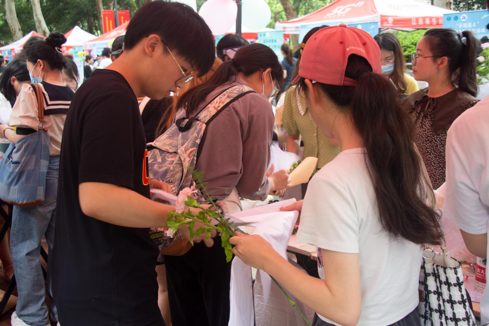 游园会开始后,许多学生来到“同心猿”工作站参与活动。其中“锦上添花”活动最受同学们的喜爱,参与者可以自由选择3-5支鲜花进行搭配,并使用包装纸、丝带包装成自己喜欢的样子。不到一小时,工作站提供的鲜花就被“一扫而光”。也有学生选择“一吐为快”活动,选择了喜欢的颜色的气球,吹大后将自己近期烦恼或者快乐的事情写在气球上,并系在工作站指定位置。计算机学院奔腾服务队积极发挥专业特色,开展“清走烦恼”活动。在专业人员的指导之下,携带电脑前来的同学体验了自己清灰、整理电脑C盘的过程,同时他们也为同学们普及电脑的实用知识。