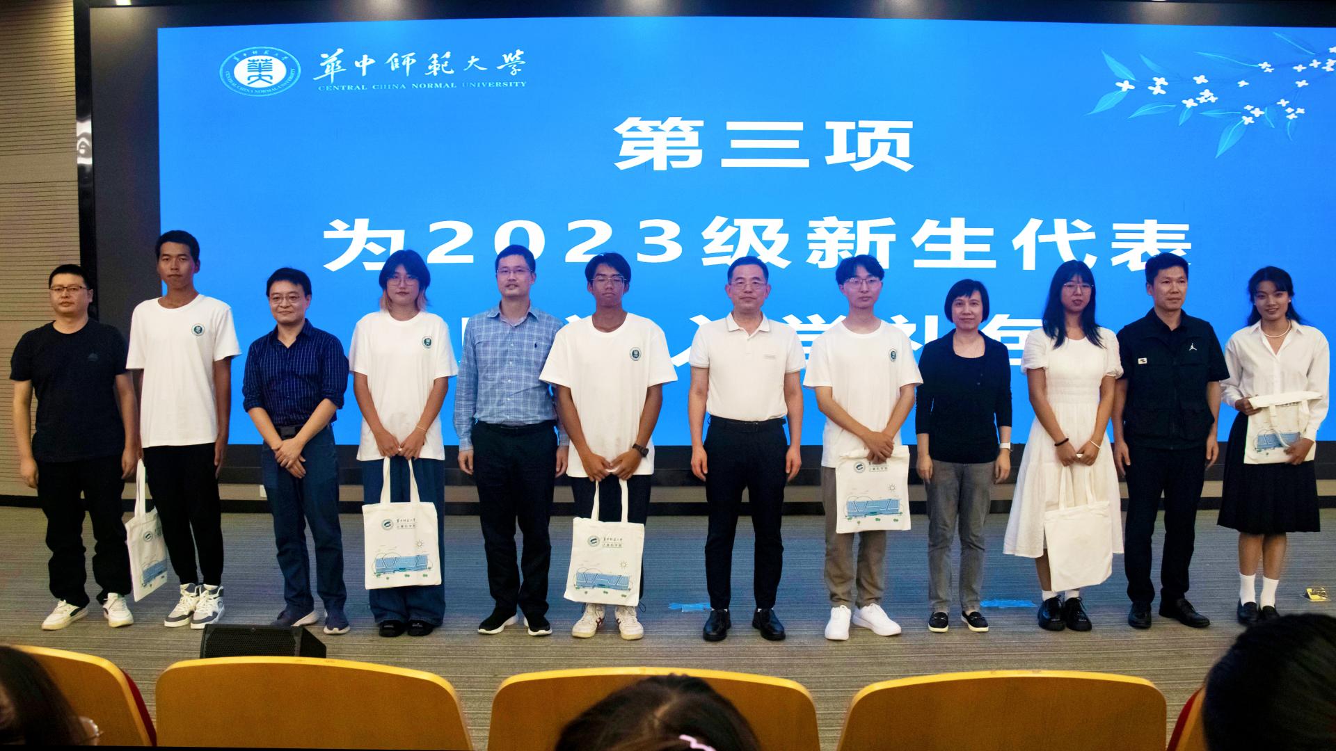 为迎接各位新同学,学院精心策划,为每位新生准备了入学礼包。在典礼现场,学院领导老师为新生代表们赠送了学院准备的精美礼物——包含《学生发展手册》《防诈骗手册》。另外,学院还为本科新生准备了讲述本科优秀学长学姐事迹的《磨砺奋进中成长——华中师范大学计算机人的故事》一书,供各位学生研学。