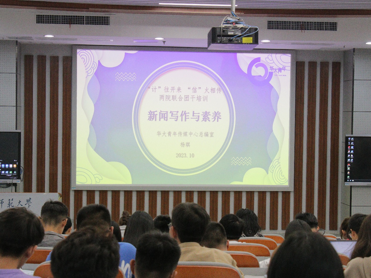 华大青年讯(通讯员 林誊 梁智浩 陈齐麟 胡欣怡 景浩洋 王敏君 辛琎)为继续加强新任团学干部对团委学生会工作的认识,提高学生干部的综合素质,10月22日下午,由计算机学院、信息管理学院联合举办的“‘计’往开来 ‘信’火相传”两院联合团干培训之宣传培训在南湖综合楼N107教室展开。本次培训邀请了华大青年传媒中心总编杨琪为团学干部就新闻写作与素养进行培训。