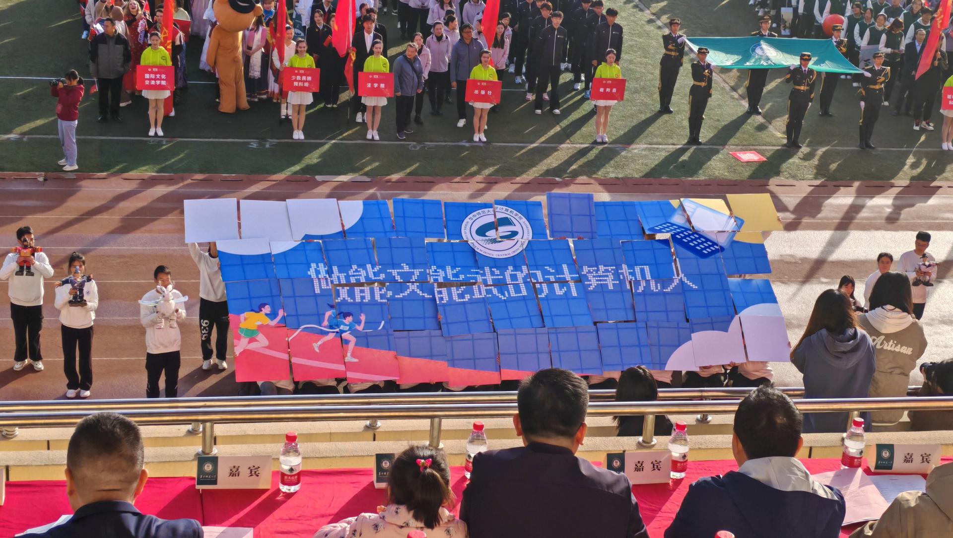 伴着入场音乐,各学院代表方阵依次入场。其中,计算机学院学生组成的方阵由机器人“大白”带领,迈着坚定有力的步伐走向主席台。“321,聚!”一声令下,他们整齐划一地举着号牌,拼凑出电脑键盘的模样,尽展计算机学院的特色。“‘计’算宇宙,‘智’绘未来”的口号掷地有声,喊出了计算机学院学子的昂扬斗志。号牌翻转,再次聚拢,方阵学员们高举号牌,拼凑出学院院徽与“做能文能武的计算机人”字样,展现了计算机学院学子的精神风貌。