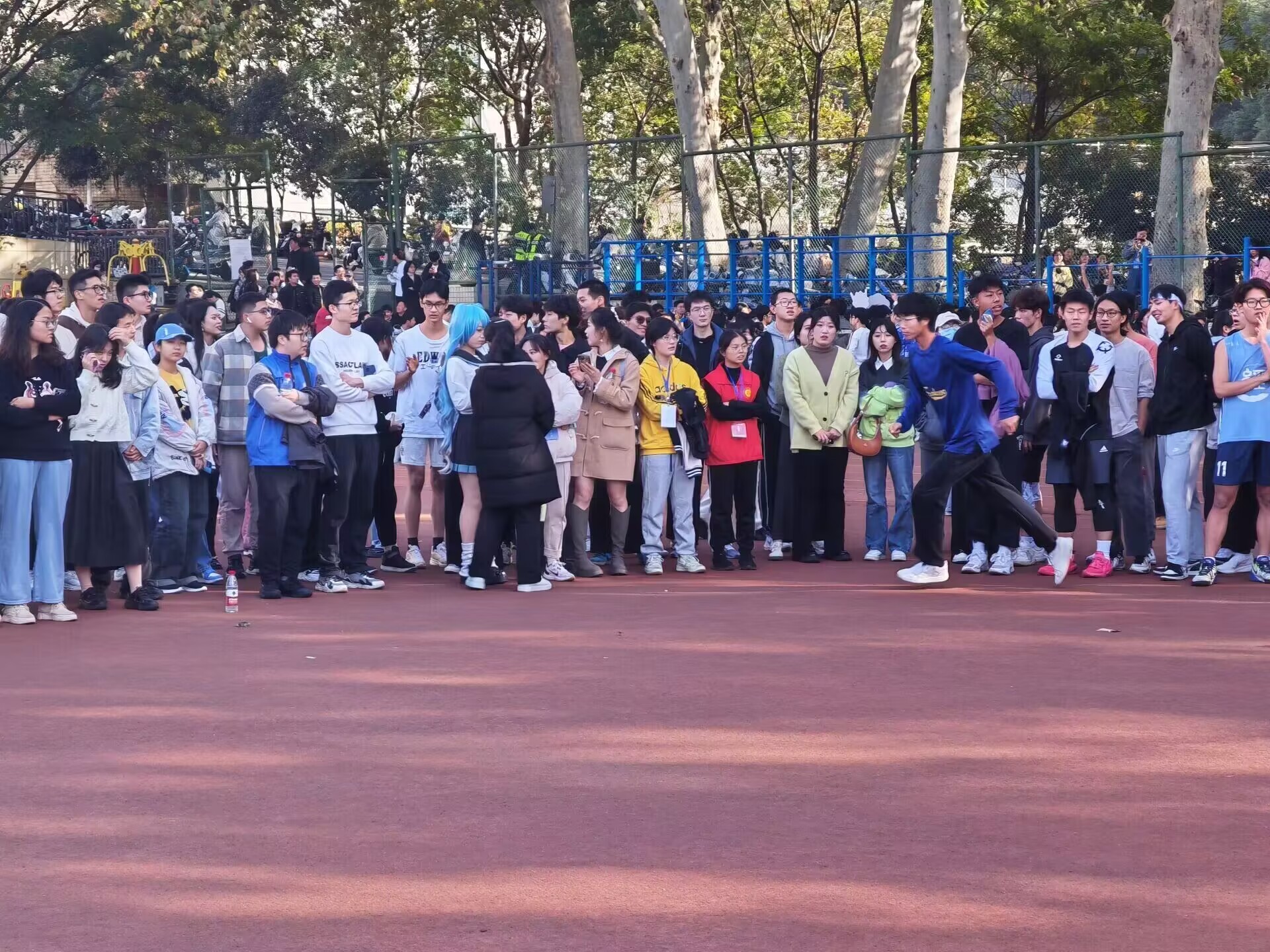 跳高比赛在和煦的暖阳下拉开帷幕。在检录完成后,计算机学院参赛选手们在志愿者的带领下前往比赛场地。初次参加跳高比赛的四名选手彼此加油打劲,调整情绪,为即将到来的比赛进行热身准备。他们小跑、跳跃,不断调整自己的身体状态,保证自己能在比赛中发挥最佳水平。赛场的氛围随着周围观众的呐喊助威声逐渐高涨。