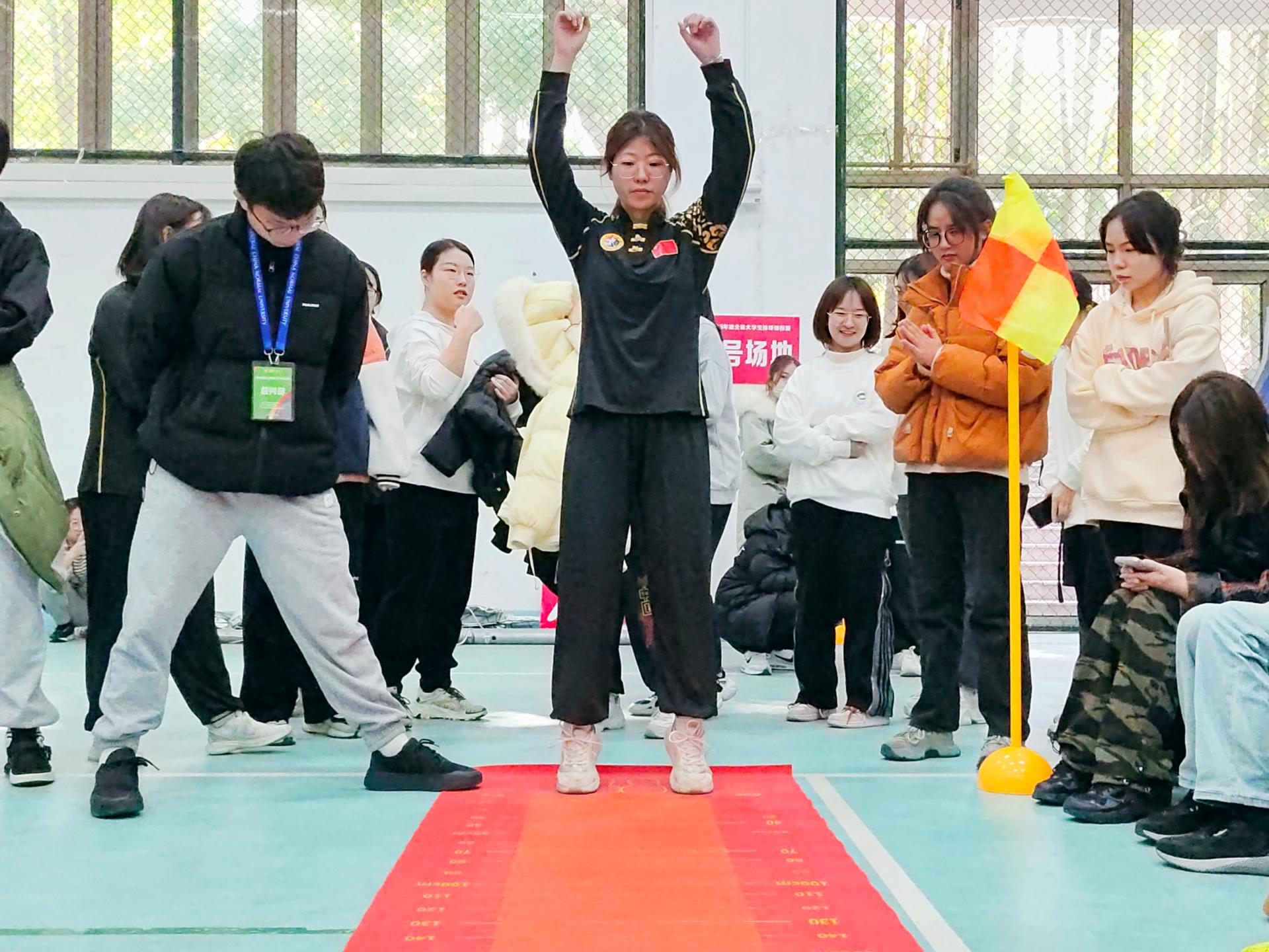 女子组立定跳远同步进行。比赛开始前,计算机学院立定跳远负责人田嘉初、朱青蔓带领队伍前往等候区进行热身检录。选手们斗志昂扬,跃跃欲试。双脚摆开、微微下蹲、向上摆臂、全力一跃、轻巧落地,迎来场下阵阵欢呼。选手们认真比赛,发挥稳定。观众们的掌声与欢呼声为紧张的赛场增添了活力与朝气。