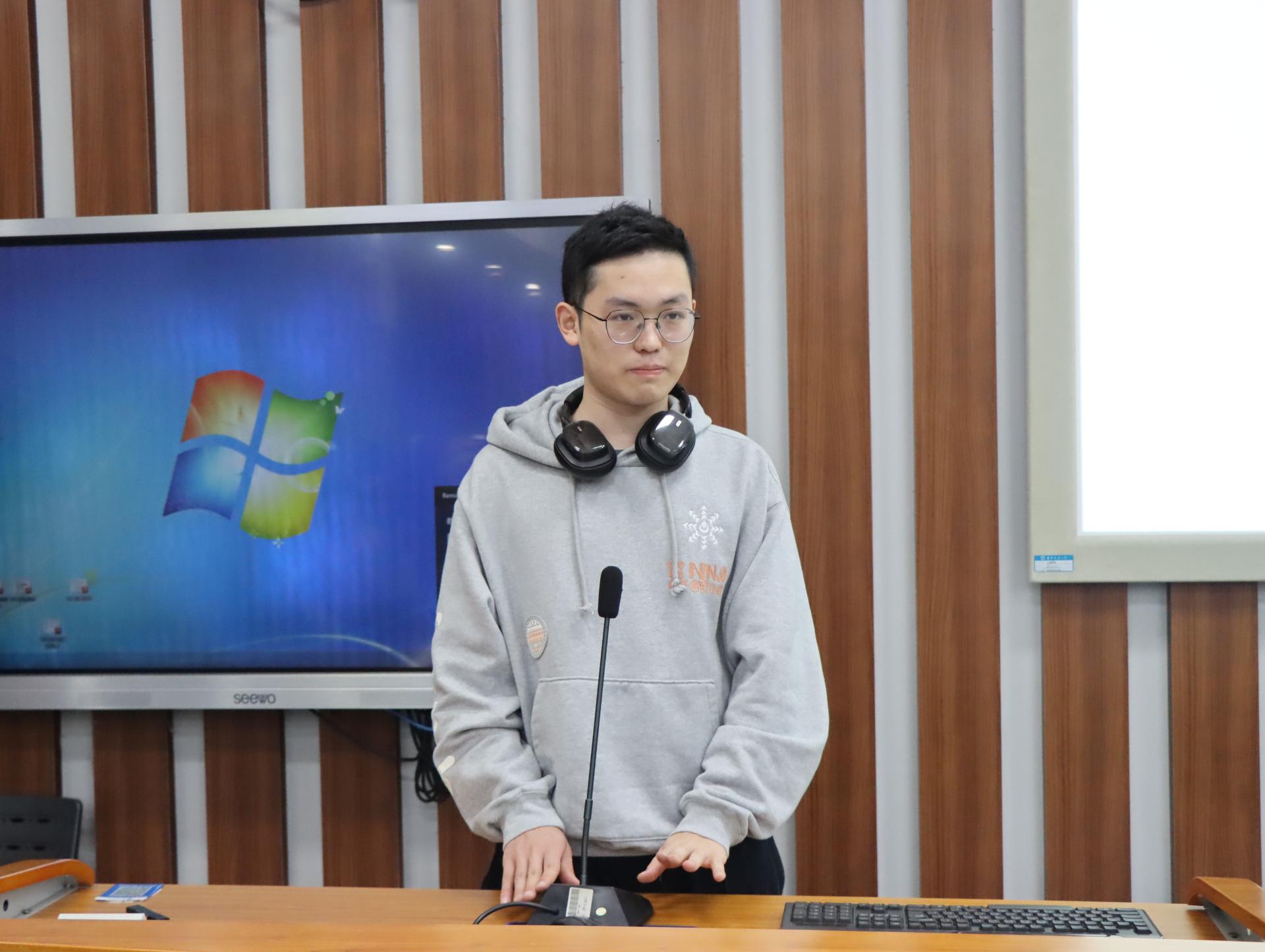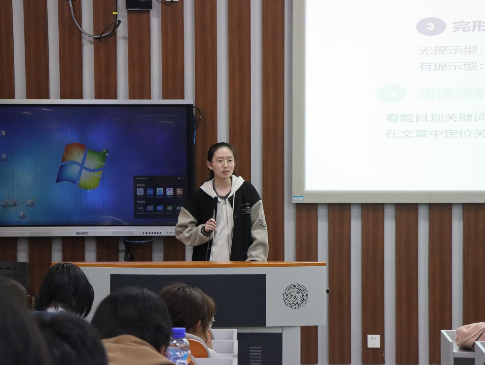 2022级本科生潘芮锐就自己的四六级考试技巧和备考经验进行分享。她提出在应对听力时,应该抽出时间读取题干,并且相信自己的第一判断,不要轻易修改答案。同时,学生还应该保持对音频及文本的理解。此外,她还分享了诸多学习资料和网站,鼓励同学们利用网络工具辅助自身的英语学习。