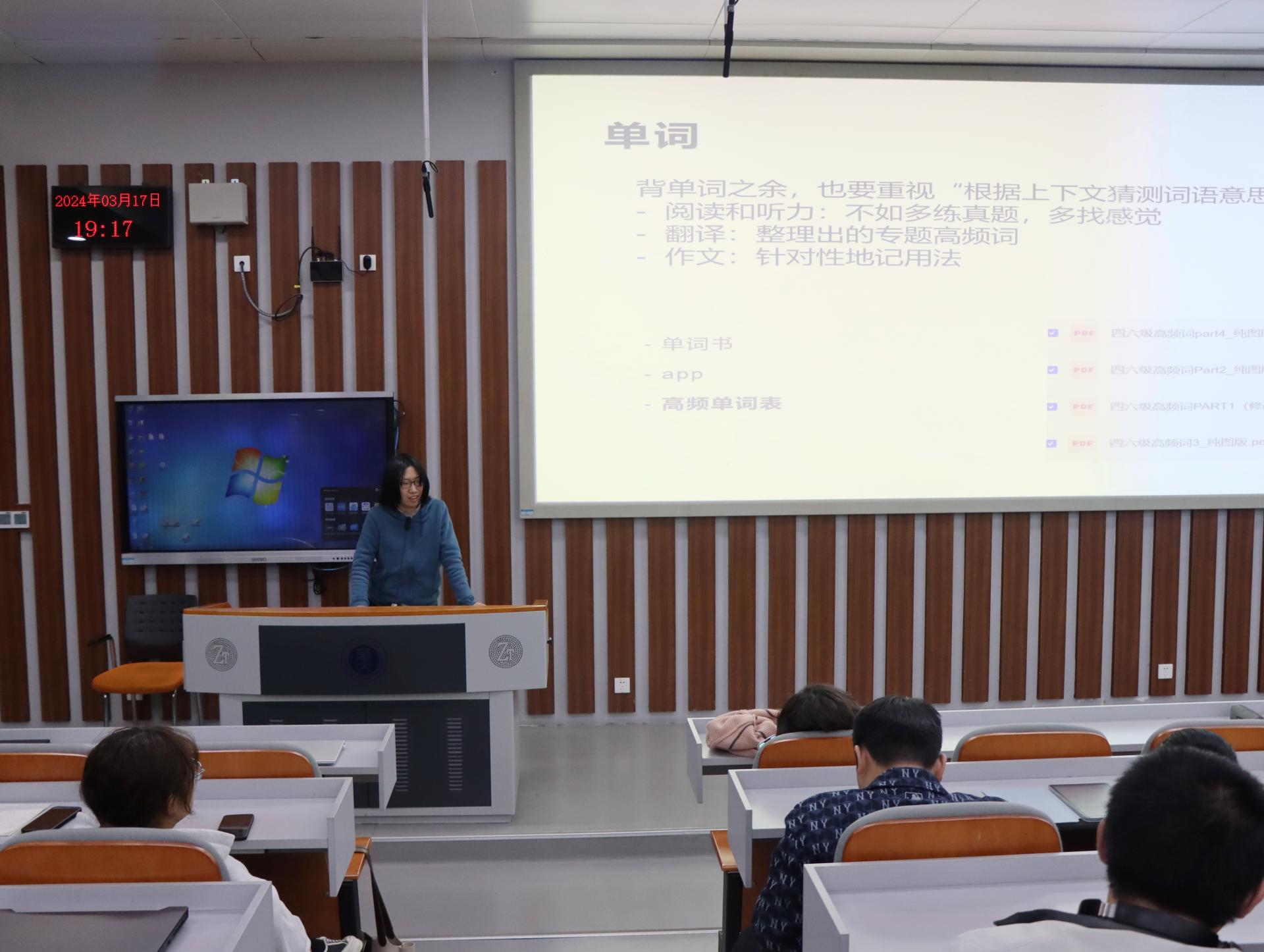 华大青年讯(通讯员 黄高涵 李欣悦 景浩洋)为帮助学院学生更好地准备英语四六级考试,提升学生的英语水平,3月17日晚,计算机学院在南湖综合楼N201教室举办英语学习经验分享会。本次会议邀请了三位在英语四六级考试中取得优异成绩、经验丰富的同学分享学习经验。计算机学院2023级本科生辅导员肖克,2023级全体本科生参与此次分享会。