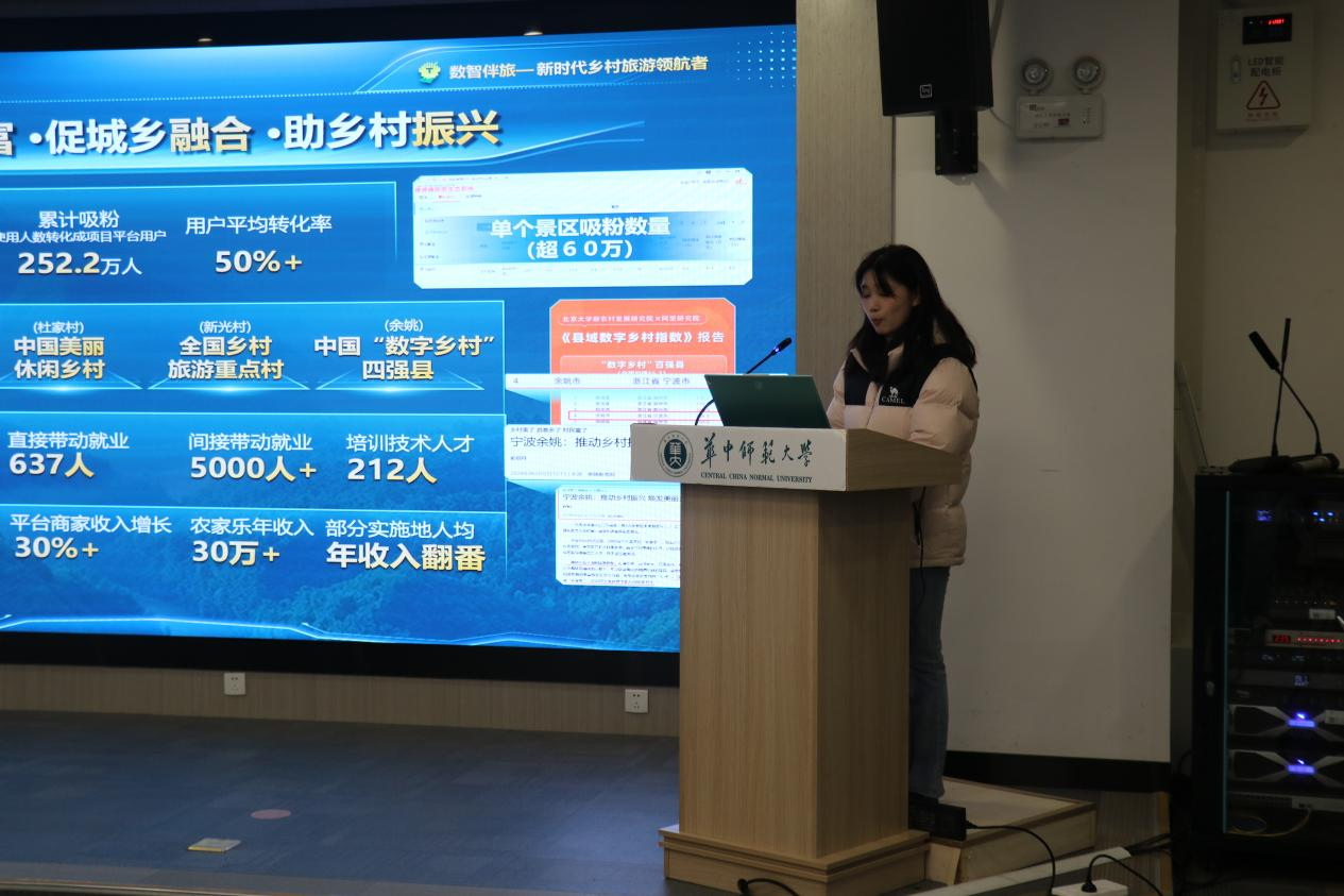 本次活动特邀第十四届挑战杯银奖得主“数智伴旅”团队进行路演。该团队以“新时代如何助力乡村振兴”为出发点规划项目,并从项目内容、优势、及反响等方面进行了详细的介绍。“数智伴旅”团队着重阐述了项目的四大优势:模式创新、技术创新、应用实践创新。此次分享不仅让学生们对新型乡村旅游项目有了清晰的认识,还提供了宝贵的答辩思绪与启示。