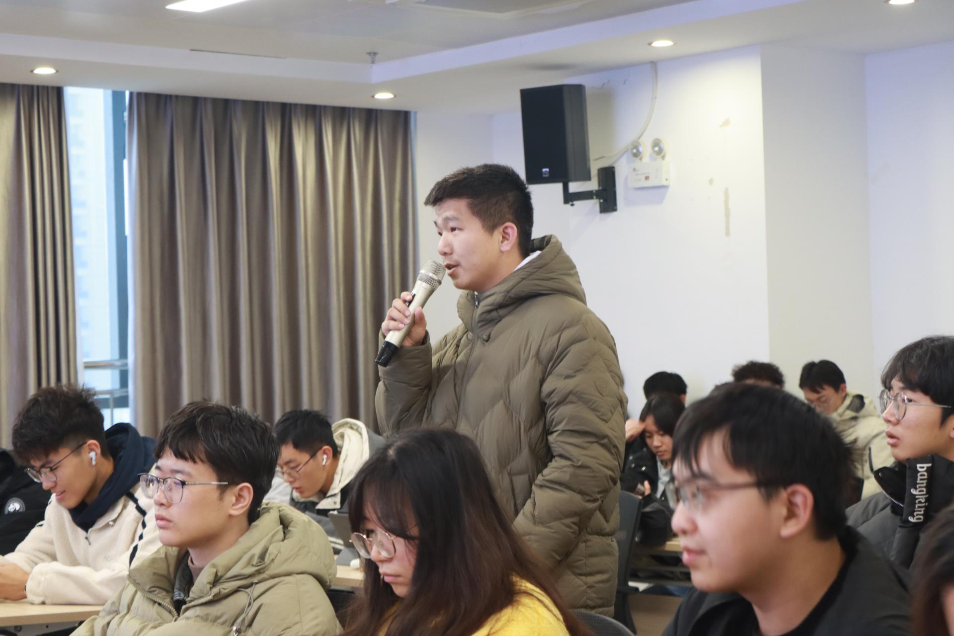 张沪寅针对大一学生提出建议,鼓励他们积极主动参与比赛,在大学早期就积累实践经验。随后他从论文、调查报告、发明制作三个方面深入浅出地分析了“挑战杯”比赛的核心要点。他分别展开讲述了论文的要求、调查报告的题目和内容的装配方式、软硬结合的科技发明等内容。讲述过程中,他还结合实际,为同学们提供了“挑战杯”相关细节要求及注意事项。这些分享加深了同学们对比赛的了解,为参加比赛的同学提供更多思路。