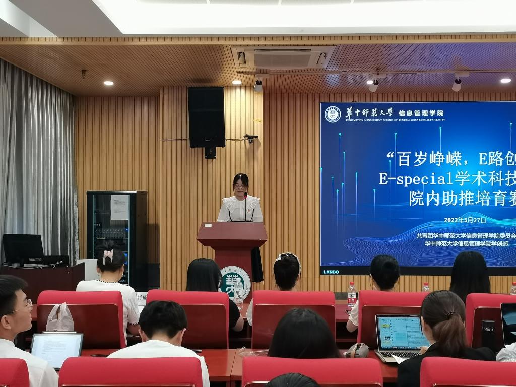 华大青年讯(通讯员 李蓓)为提高大学生创新能力,进一步激发大学生大众创新的潜能,5月27日晚,信息管理学院“E-special”学术科技作品助推培育赛举行。本次助推赛由共青团华中师范大学信息管理学院委员会主办,信息管理学院团委学生会学创部承办。第十七届“挑战杯”全国大学生课外学术科技作品竞赛国赛获奖选手中国农村研究院刘凤萍、邓华,公共管理学院胡晓冰晗,经济与工商管理学院兰雨馨,马克思主义学院蔡方、吴宇珊,信息管理学院团委书记肖丽霞,助理辅导员黄栊婵、周梦蝶对作品进行点评及指导。