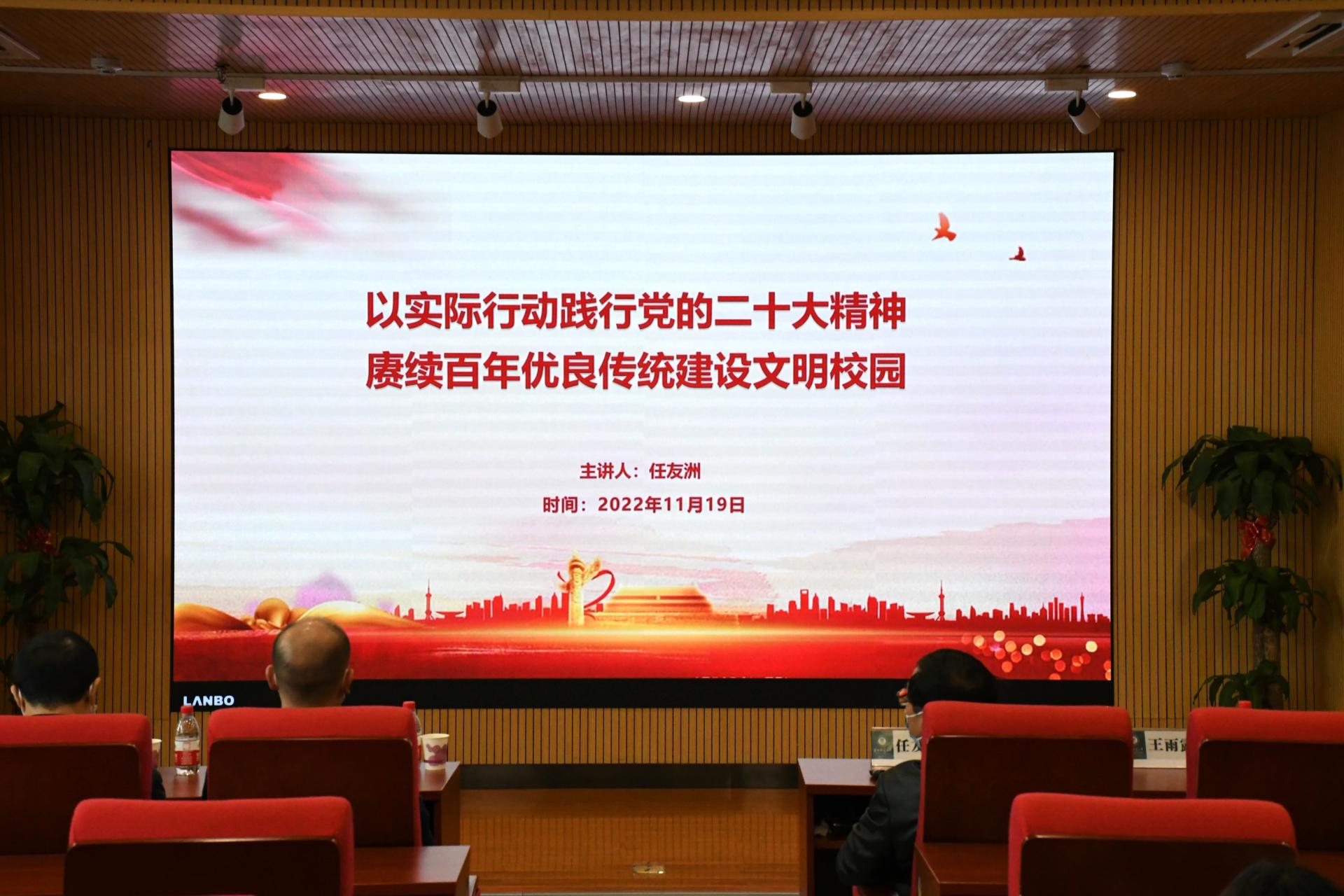 活动伊始,任友洲带领大家深入学习党的二十大精神,明确全面落实“立德树人”的根本任务。他从实施科教兴国战略、强化现代化建设人才支撑,推进文化自信自强、铸就社会主义文化新辉煌,推动绿色发展、促进人与自然和谐共生三部分展开讲解,并从教育、科技、创新、人才四个方面重点阐释了实施科教兴国的具体做法。