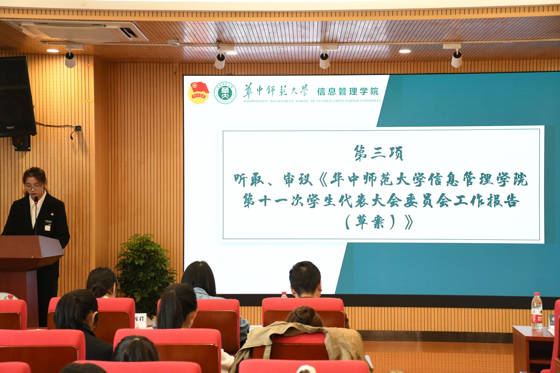 会议开始,全体参会成员庄严站立,共唱国歌。接下来,依次听取、审议了《华中师范大学信息管理学院第十二次学生代表大会代表资格审查报告》、《华中师范大学信息管理学院第十一次学生代表大会委员会工作报告(草案)》、《华中师范大学信息管理学院第十二次学生代表大会提案工作报告(草案)》。