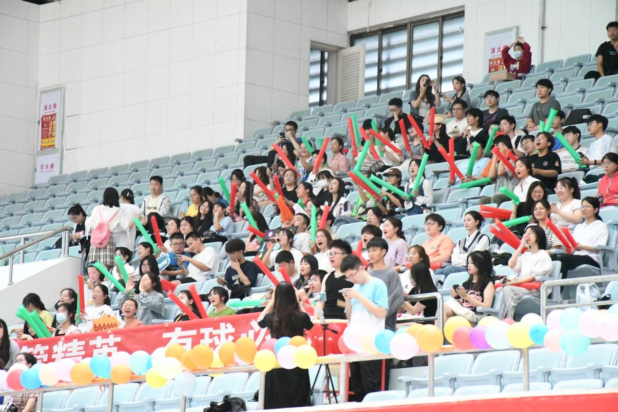 第三轮、第四轮比赛中,信管学院和数统学院气势相当,不分上下,你攻我守。现场观众的尖叫声、欢呼声凝聚成强大的精神力量,鼓舞着球员们奋力拼搏。双方发球、一接、二传、扣杀、拦网、扑救,每个动作都干脆利落,两队势均力敌,比分一直齐平,场面逐渐变得焦灼。第三、四轮比赛信管女排与数统女排各赢一局,大比分来到了2:2,进入最后的决战之巅。