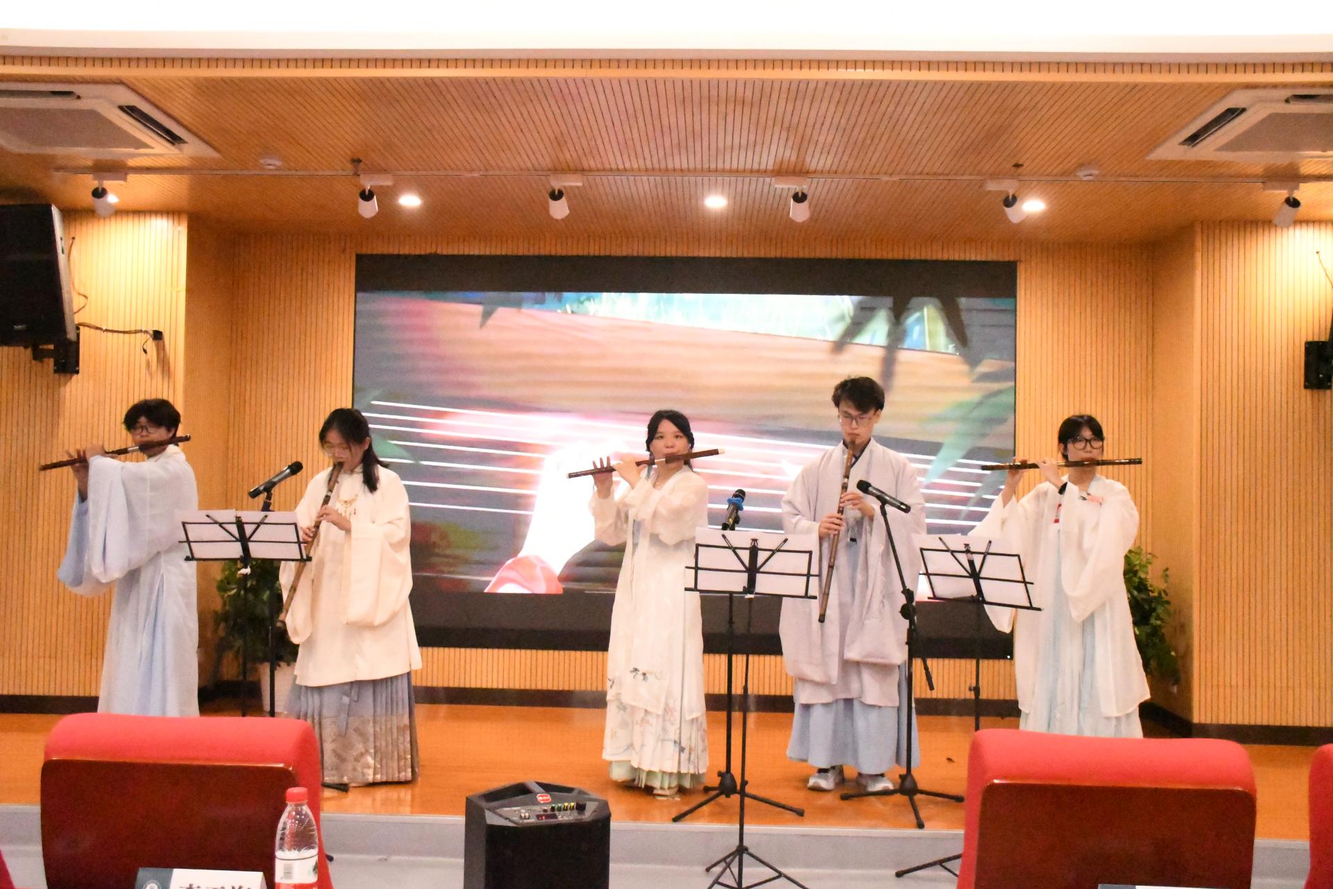 音乐声环绕报告厅。由周婷、郝国强、冯康康三位同学带来的《星汉灿烂》节目,配合着一轮红日,悠长而宏大的笛声缓缓而出,让人想起了“日月之行,若出其中;星汉灿烂,若出其里”里描绘的景象;罗婧、孙萌、申冬旭、冯康康带来的《烟雨行舟》,他们统一穿着汉服,配合小桥流水的背景动画,仿佛让人置身于江南小镇。还有申冬旭、孙萌、冯康康带来的《星河叹》,杨琛、王存阳、罗婧、左雅楠、杨洪利带来的《惊鹊》也同样精彩。最后是狗尾草陶笛社带来的《送别》,正值毕业之际,这首曲子也表达出了毕业离别时的感伤与期许。