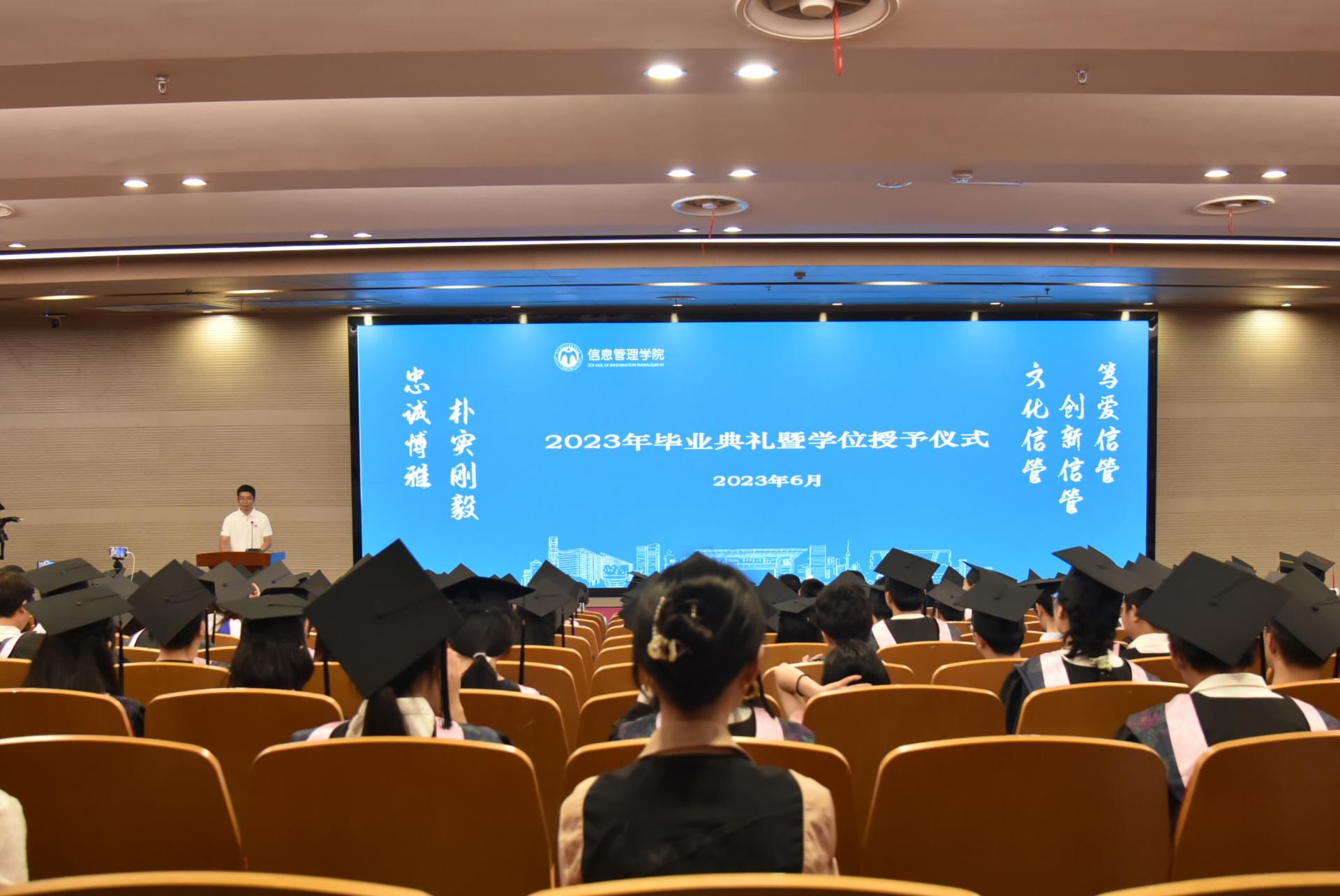 华大青年讯(通讯员 戴欣妍 陆璟瑶)6月11日下午,信息管理学院2023年毕业典礼暨学位授予仪式在南湖综合楼学术报告厅举行,大会由学院党委副书记王涛主持。武汉祐禾餐饮管理有限公司董事长刘春华、学院2005级校友吕世国、学院党委书记王雨露、院长李玉海、学术委员会主席娄策群、副院长曹高辉以及学院全体教师出席,2023届全体毕业生及家长代表参加,大会实施线上同步直播。