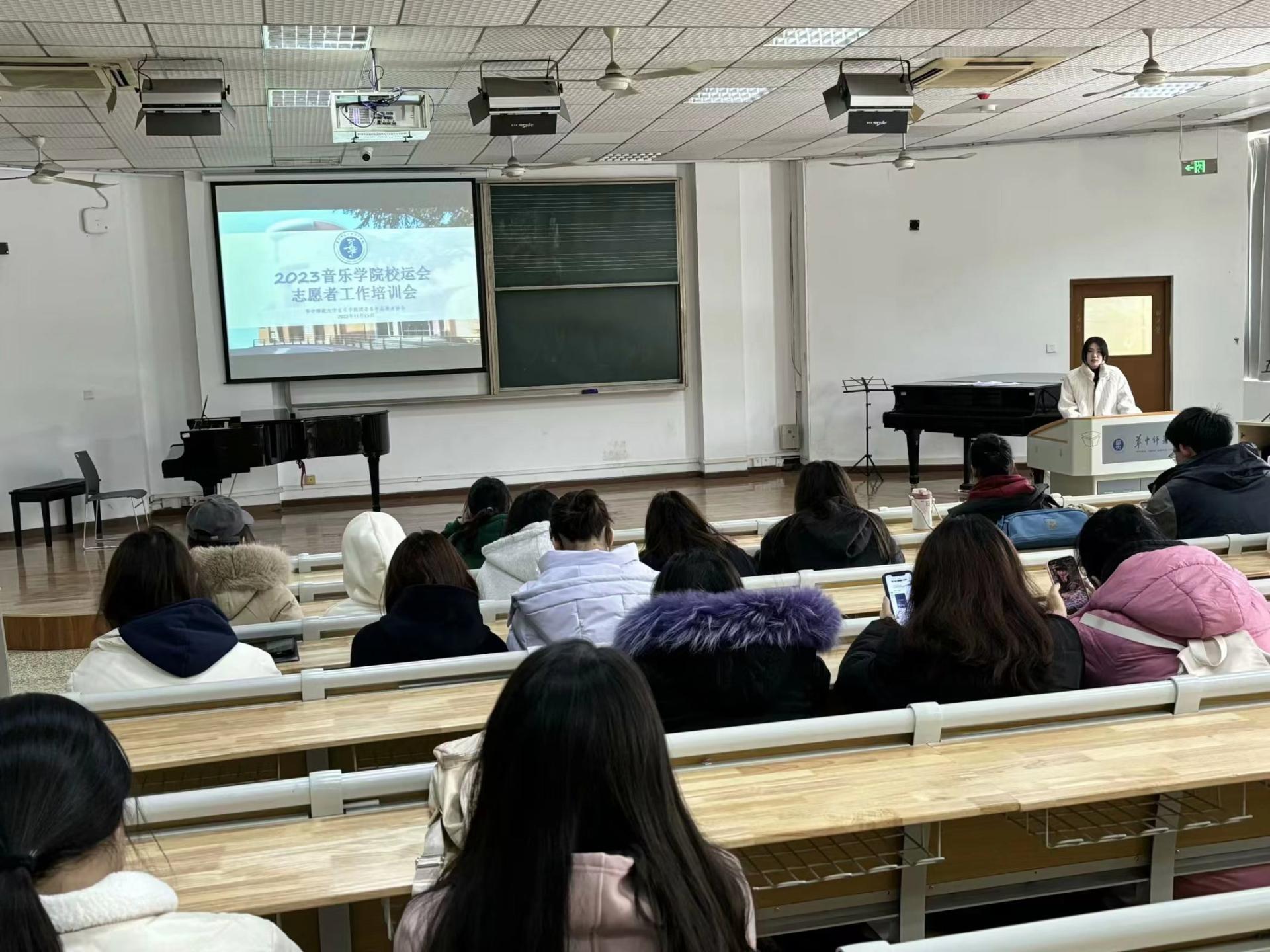 音乐学院青年志愿者协会负责运动会志愿工作的筹划与推进,拟定志愿者工作种类与人数,同时制定了一系列志愿者管理条例,以确保志愿服务工作顺利开展。赛前,青年志愿者协会召集所有志愿者进行工作培训,为志愿者划分职责,明确分工,确保每一环节的万无一失。