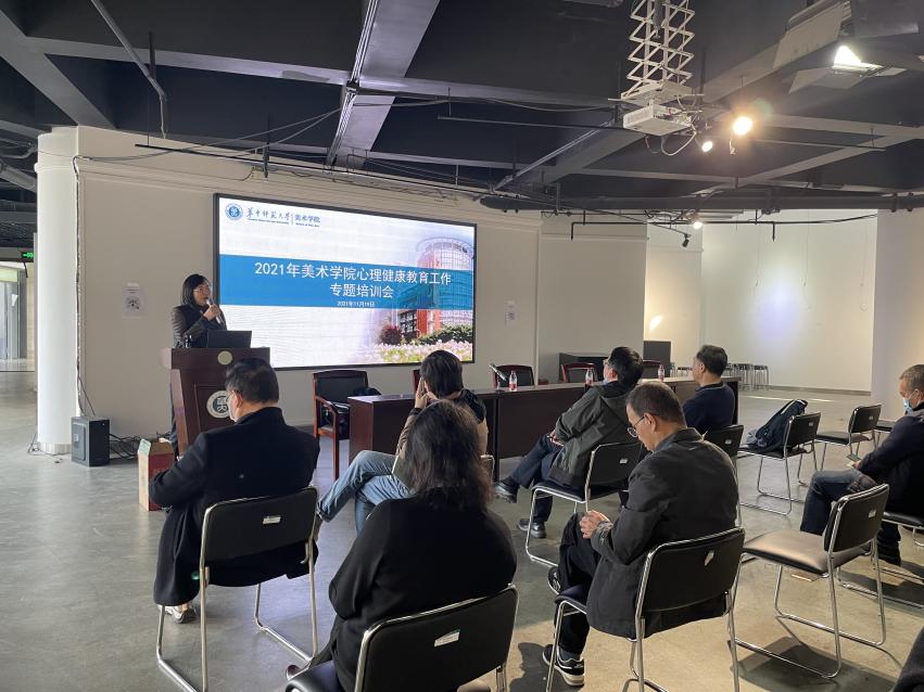 华大青年讯(通讯员 高瑞阔 吴诗颖)为进一步提升教职人员专业技能,推动心理健康教育工作有序开展。美术学院班主任、导师培训会暨心理健康教育工作专题培训会在11月19日下午于美术学院八楼报告厅举行。本次培训会由华中师范大学心理学院教授、华中师范大学心理健康教育中心常务副主任吴才智教授进行《我校大学生心理健康教育工作形势与建议》专题培训,美术学院全体教职工参与培训,培训由党委副书记李宪玲主持。