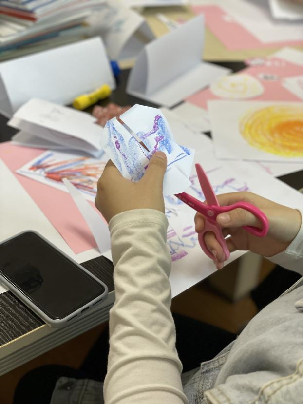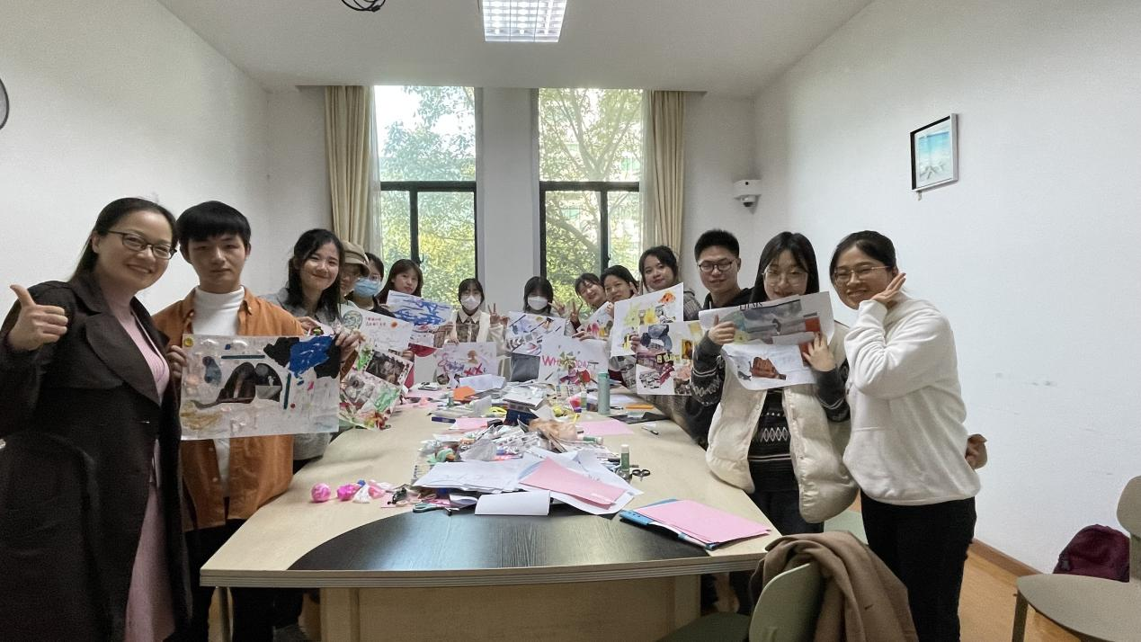 活动伊始,段文婷和陈真珍老师简要介绍了此次活动的内容和目的,希望大家能够在活动中了解情绪,并更好的认识自己,舒缓压力。随后,段文婷让同学们做好台签并写上昵称,并要求同学们从“温度”“湿度”“硬度”三个方面依次进行自我介绍并用一个动作来表现自己以及此刻心情,同时获得同学们相应动作的欢迎。自我介绍完毕后,段文婷播放了一段轻音乐,希望同学们能在此中放下一切包袱,尽情享受此刻舒缓的时光,以此凝心聚气更好的投入此次活动。接着老师们引导大家闭上眼睛,用彩色的蜡笔以及五张A4纸来分别描绘自己的五种情绪色彩,分别是“快乐”“悲伤”“焦虑”“愤怒”“活力”。同学们在闭上眼睛感知自己情绪流淌迸发的同时也完成了属于自己独一无二的画作。