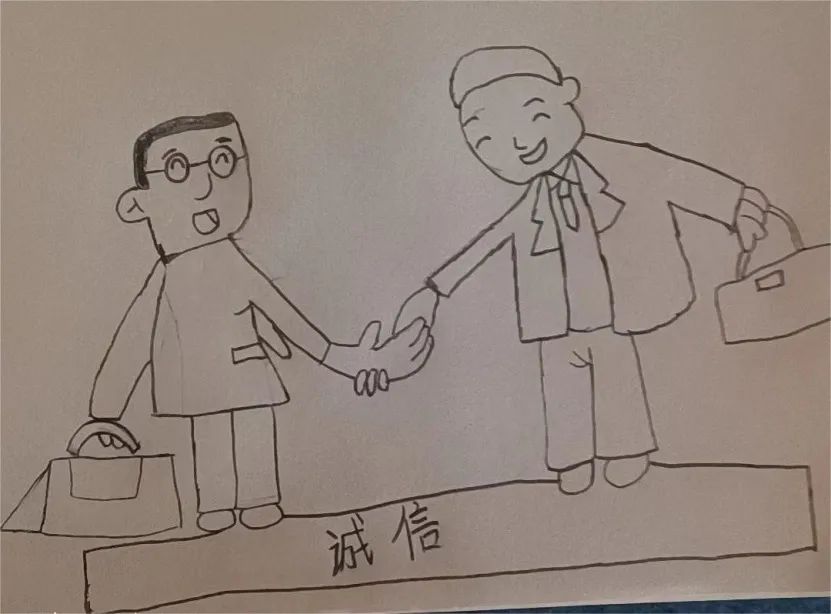 11月29日,志愿者以“与人诚信”为主题开展线上志愿服务活动。志愿者主动了解学员的绘画水平,改进教学目标,精简绘制内容,并在几次讨论后,决定用简笔画表达主题。画面以两个真诚握手的小人作为主体,脚踏诚信之桥,形象阐述内容的同时,画面简单易学,学员们可以轻松完成绘制。通过本次活动,学员们逐渐理解与人诚信的重要性,学会用自己手中的画笔画出诚信之桥,将“与人诚信”深记心中。
